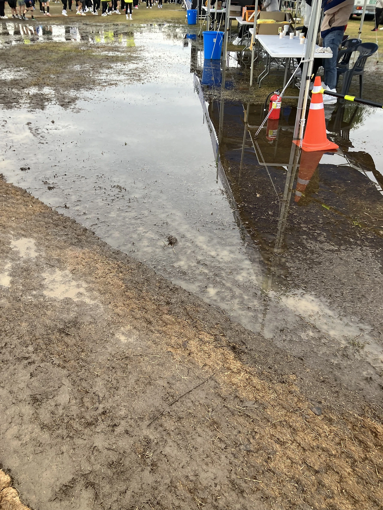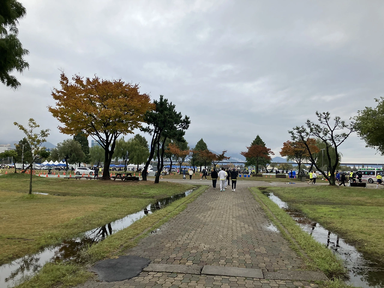토요일 저녁부터 많은 비가 내려 대회 당일 새벽 잠시 고민했지만 이미 내 마음은 대회장에서 준비를 하고 있었고 어제 준비한 대회 복장을 입고 삼락생태공원으로 향했다. 보통의 대회와는 달리 오전 10시에 출발해서 시간적 여유가 있어서, 오전 8시에 도착해도 테이핑과 웜업을 해도 충분했다. 다만 아직 빗물이 흥건한 땅이라 행사장 안으로 들어가진 않았다.