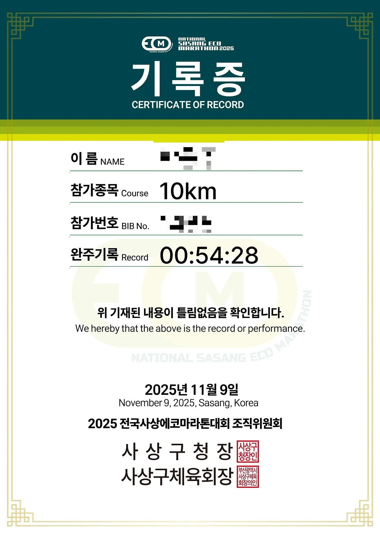 거친 숨을 고르며 완주 기념품을 수령하고 기록을 확인했는데 소망했던 대로 55분의 벽을 깨는 기록이어서 너무 좋았다. 기록증을 보는 순간, 지난 일 년간의 달렸던 모습이 눈앞에 파노라마처럼 지나가면서 진정한 성장의 기쁨을 느낄 수 있었다. 4분을 단축하기 위해 얼마나 노력했는지 나 자신만 안다. 26년에는 4분을 더 앞당겨 50분의 벽을 깰 수 있도록 더 열심히 노력할 것이다.