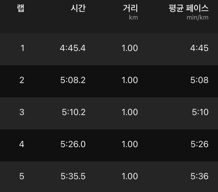 가민 워치에 기록된 랩타임을 보면 1~3km 구간은 5분 초반대의 페이스로 달렸는데 4분 페이스는 물론 5분 페이스는 그 어떤 대회에서도 없었던 첫 경험이다. 단 한 번도 시도하지 않았던 이 페이스가 가능했던 이유는 주 1회 인터벌 훈련으로 4분 대 페이스 훈련을 했기 때문에 가능했다고 생각한다. 그토록 힘들었던 인터벌 훈련이었지만 기록 단축에는 특효약이라는 것을 느꼈다.