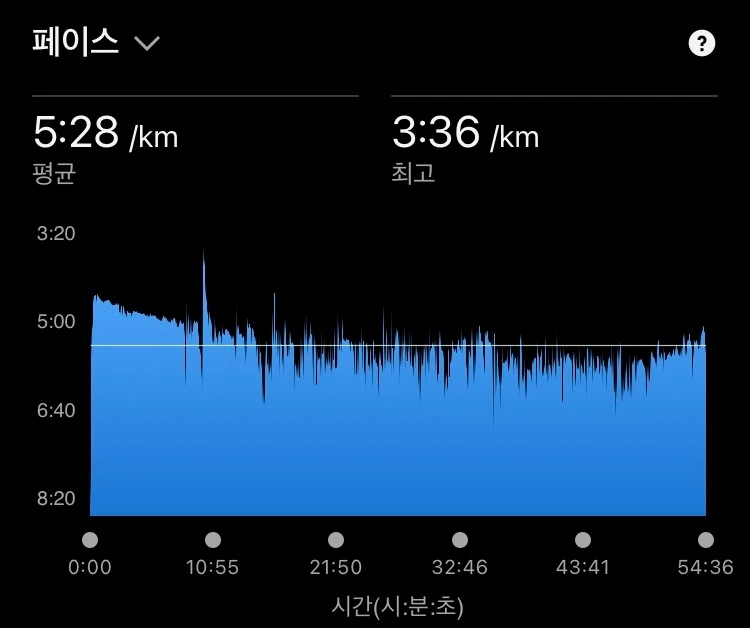 이후 7km 구간까지는 5분 30초 대의 페이스를 유지하며 달렸는데 8~9km 구간에서 에너지젤을 먹다 사레가 들려 호흡이 어려워 페이스를 5분 후반대로 늦을 수밖에 없었다. 이 부분이 가장 아쉽고 아쉬운 점이다. 만약 이 구간에서도 동일한 페이스를 유지했더라면 53분의 벽도 충분히 깰 수 있었을지도 모른다. 그리고 마지막 9km 지점에서도 스퍼트를 하지 않았던 것도 마음에 걸린다.