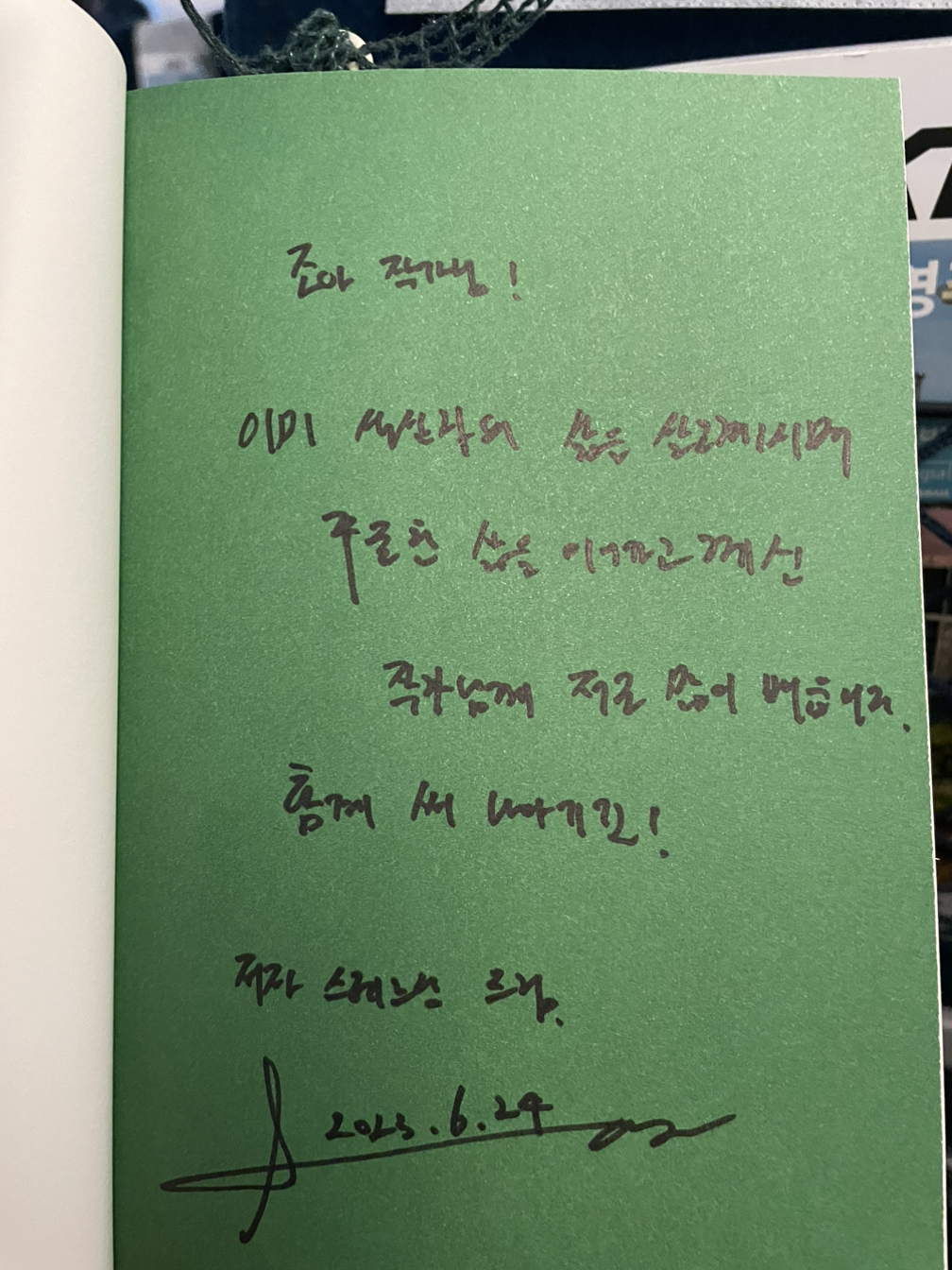 <비에도 지지 않고>, <더우면 벗으면 되지>, <지혜로운 멧돼지가 되기 위한 지침서> 세 권의 그림책은 아이뿐만 아니라 어른에게도 삶에 대한 울림과 지혜를 준다. 특히 정성스럽게 만들어 주신 그림수첩에 자신의 생각을 적어보면서 마음과 감정을 표현할 수 있는 것이 제일 좋았다. 하지만 정성스럽게 만들어 주신 그림수첩을 간직하고 싶어 노트에 옮겨 적어 작가님의 마법을 직접 체험하면서 그림책에 대한 갈망이 더욱 깊어졌다. 오늘 소개해주신 그림책은 아이와 함께 읽으며 서로의 생각과 감정을 그림수첩으로 나누면 좋겠다는 생각이 들 정도로 감동받은 나의 마음을 아이에게도 전해주고 싶은 욕구를 자극하는 시간이었다.