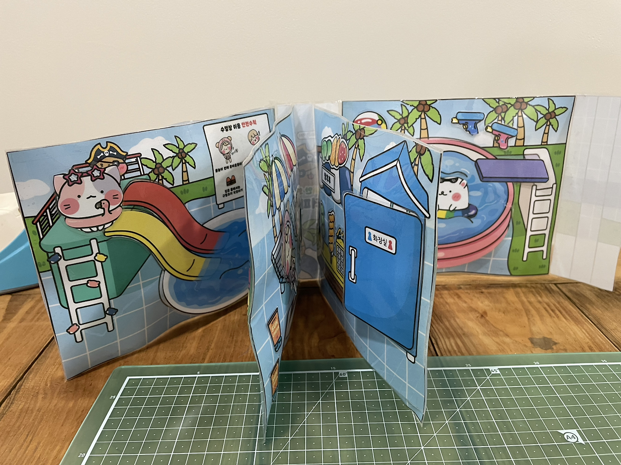 책 읽기와 글쓰기에 정신없었던 나를 배려했던 아이가 그동안 벼르고 벼른 온갖 도안 중에서 심사숙고를 해서 워터파크 도안을 선택하였다. 아내를 닮아 물놀이를 좋아하는 아이의 성향이 반영된 선택이었고, 만들어야 할 것이 은근히 많았기에 같이 만들고 싶어 한 것 같다. 아이의 선택을 존중하며 도안을 오리고 코팅을 하면서 본격적인 만들기를 시작하였다.