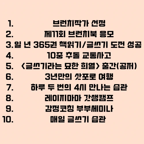 올해 나의 10대 뉴스 키워드 중 가장 핵심인 뉴스로 매일의 글쓰기 습관 때문에 많은 삶의 변화가 일어났다. 새벽 기상부터 책 읽기, 필사 등 글쓰기를 하기 위해 나만의 시간을 확보하고 글감을 얻기 위해 책을 읽으며 작가의 문장과 생각을 훔치면서 나는 점점 그들을 닮아가고 있다. 아직 1년밖에 하지 않았지만, 평생의 습관으로 만들기 위해 매일의 노력을 다할 것이다.