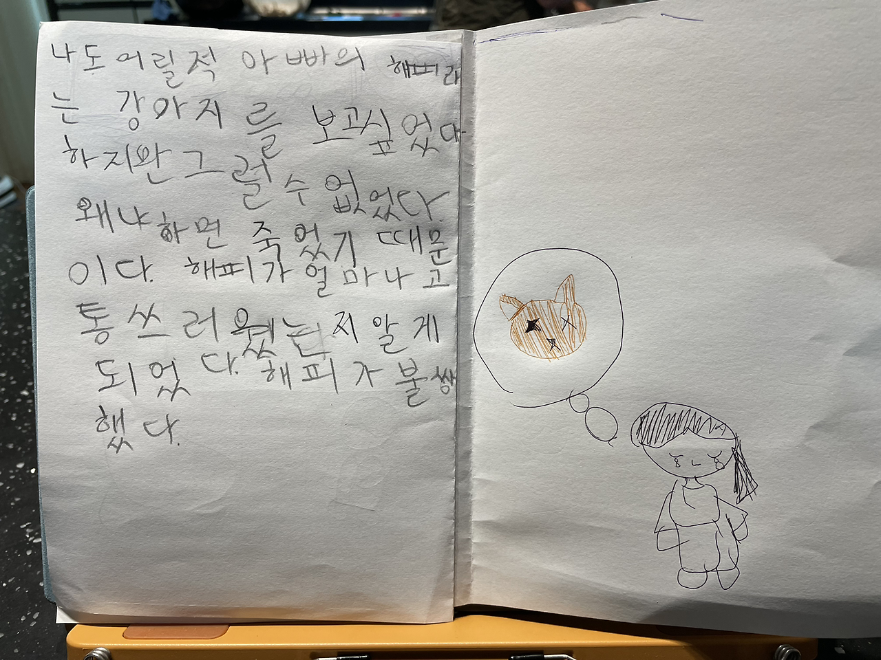 책 쓰기의 글감은 내가 좋아하는 동물로 나와 아이는 개를 좋아해서, 내가 어릴 적 키웠던 개의 이야기를 아이는 그림으로 그리고, 나는 글을 쓰기고 했다. 책 제목에 대해서 심도 있게 의견을 나누다, <그때 지켜주지 못해 미안해>로 결정했고 그림을 그리기 위해 당시 상황 설명을 최악의 그림 실력이지만 정성껏 그려서 아이가 이해하기 쉽도록 그려주었다.
