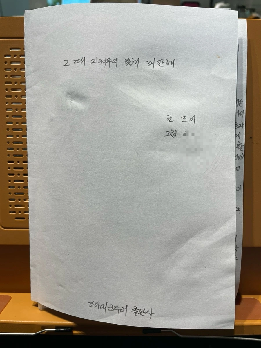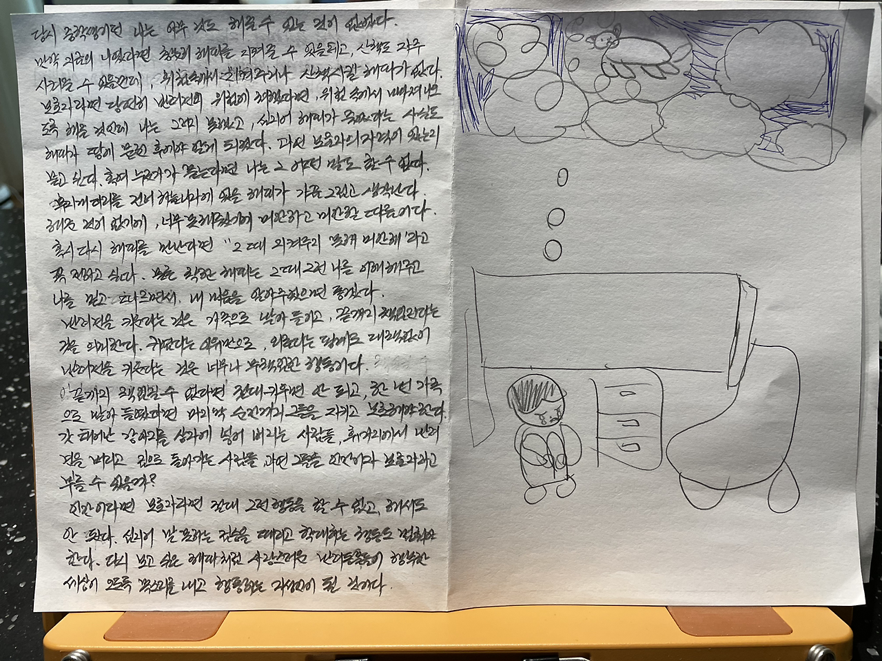 아이의 그림을 보고, 과거의 일을 떠올리며 글을 썼는데 그림 한 장, 글쓰기 한 장으로 책을 구성했다. 아이가 만든 책은 표지를 제외하고 총 6 페이지로 아이는 그림 세 장과 글쓰기 한 장, 나는 글 두 장을 쓰기로 했다. 평소 종이에 써본 적이 없어서 엄청 어색했지만, 아이와의 공저 작업을 위해 최선을 다해 글을 썼다.