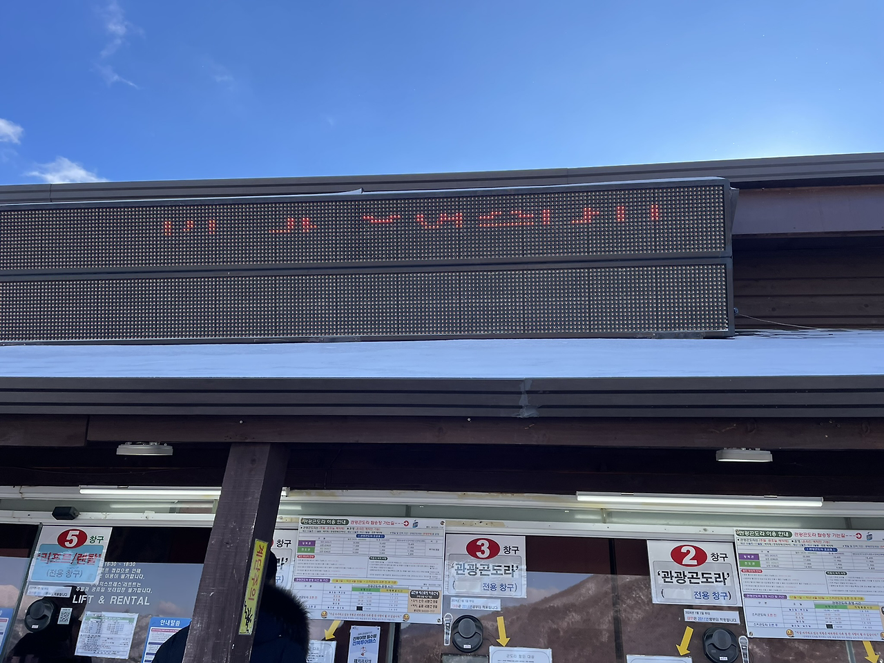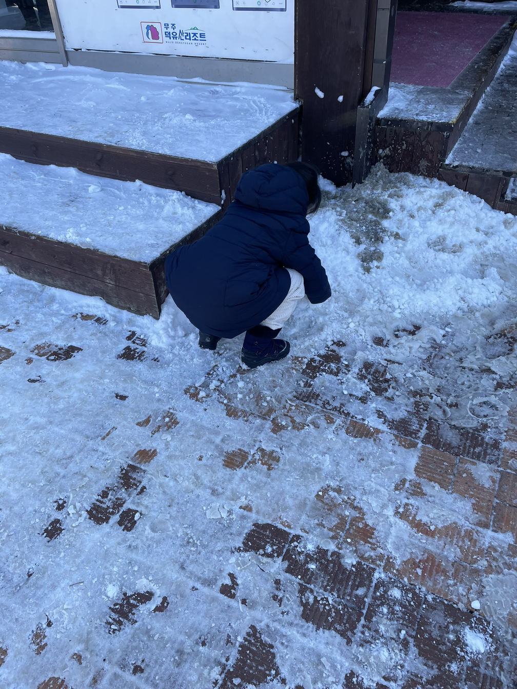 향적봉의 눈꽃을 기대하는 마음으로 케이블카를 다려고 하니 기상 악화로 운행을 하지 않는다는 방송이 흘러나왔고, 당황한 마음에 매표소에 물어보니 어제부터 운행을 하지 않았다고 했다. 미안함 마음에 당황한 표정의 장모님과 케이블카 운행 중단과는 상관없다는 표정으로 옆에서 눈을 만지며 이미 놀고 있는 아이 사이에서 잠시 눈치를 봐야만 했다.