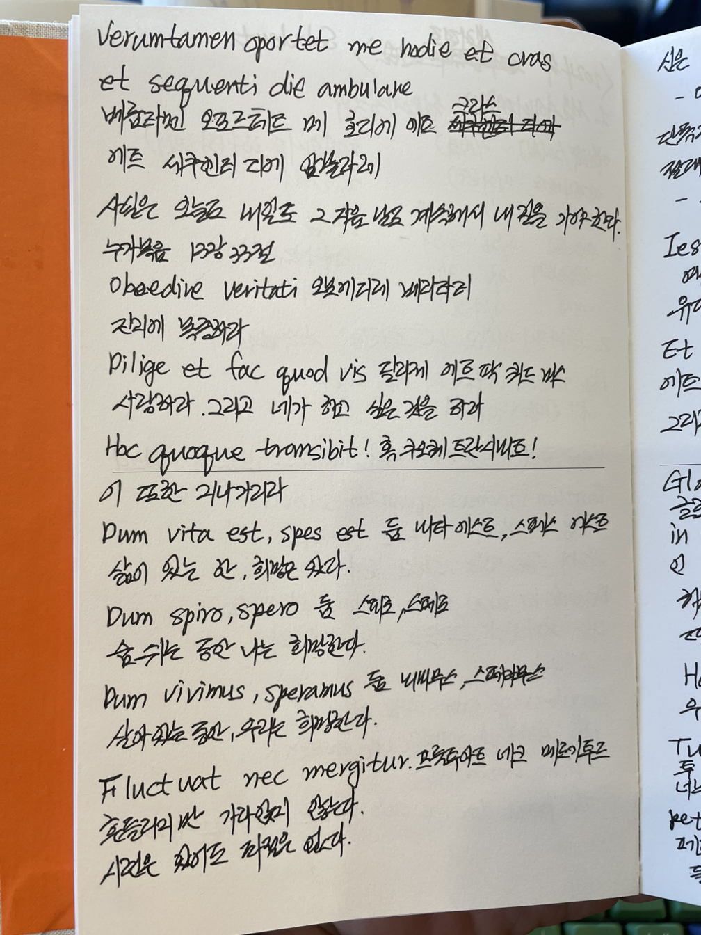 라틴어 문장을 쓰면서 우리나라도 1966년까지 라틴어로 미사를 드렸다는 사실에 놀랐고 내가 주로 사용하는 미쯔비시사의 ‘시그노’라는 볼펜도 표시라는 뜻의 라틴어라는 사실에 더 놀랐다. 생활 속에 깊이 높아 있는 라틴어를 사용하면서도 라틴어인지 몰랐던 나의 무지가 조금씩 깨어지면서 조금씩 지성인이 되어간다는 느낌이 든다. 하지만 지성인은 많이 배우고 지식이 많은 사람이 아닌, 머릿속의 지식을 실천하며 남에게 선한 영향을 주는 사림이라는 것을 알고 있기에 먼저 나를 다듬고 다스리는 시간을 가져야 한다.