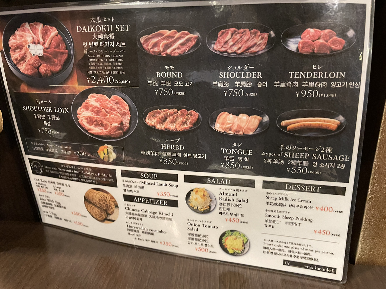 오후 5시부터 문을 여는데 다행히 웨이팅을 하지 않고 바로 입장했고 바 테이블이 아닌 4인석 자리를 안내받아 지금까지 따닥따닥 붙어 앉았던 것과는 달리 편하게 이야기를 하며 먹을 수 있었다는 것이 정말 좋았다. 삿포로시의 징기즈칸보다 가격도 저렴해서 부담 없이 즐길 수 있었다.