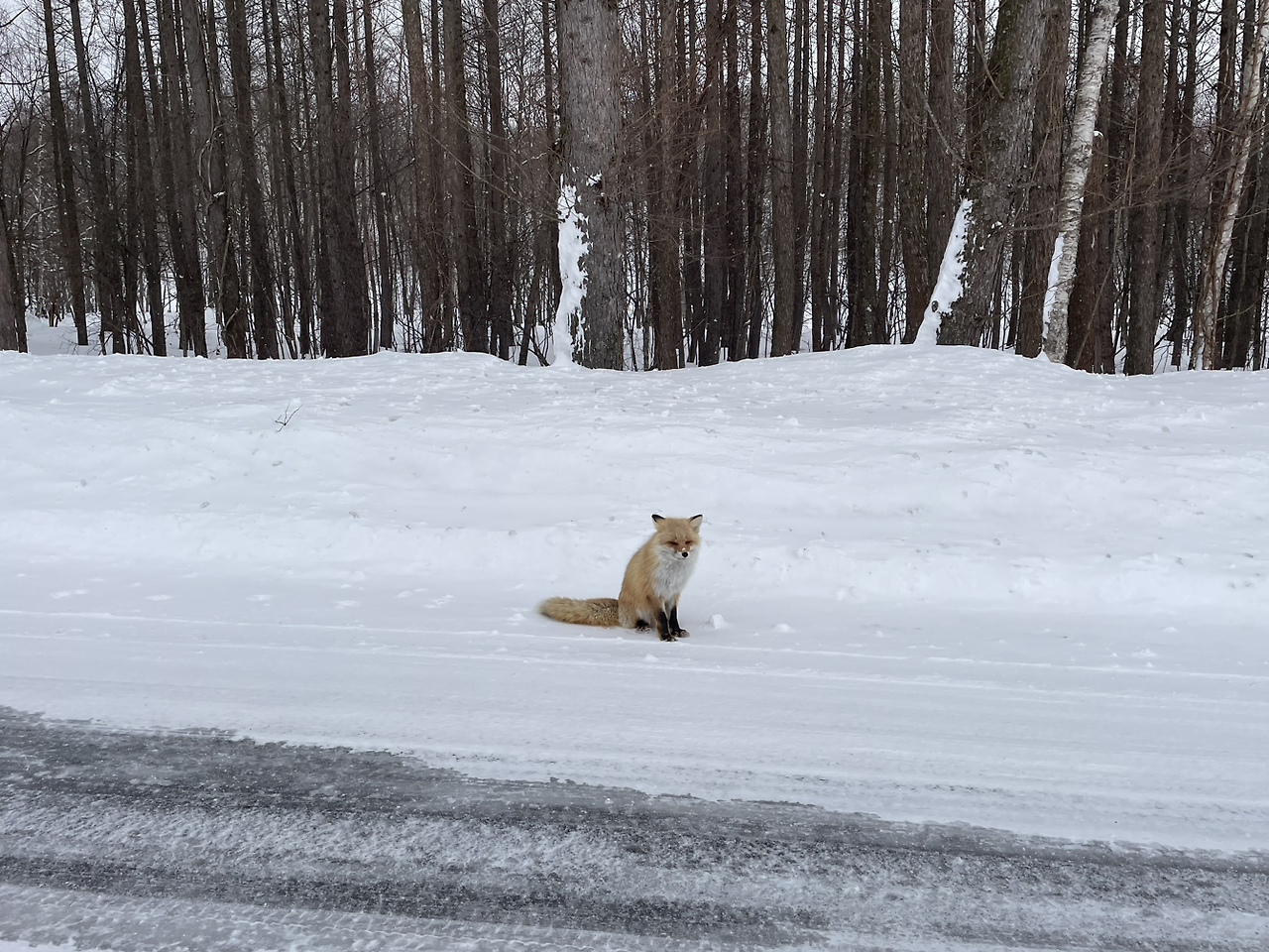 그리고 이곳은 고지대에 있어 3월 중순이지만 도로에 눈이 쌓여 있고, 이날 눈까지 와서 정말 긴장과 집중의 운전을 했다. 과속은 절대 금물이며, 운 좋으면 지나가는 길에 홋카이도 여우를 만나는 행운을 누릴 수도 있다. 바로 옆에 정차해도 도망가지 않는 것을 보면 사람을 많이 만나본 유경험자라는 것을 금방 알 수 있었고 먹이를 바라는 것 같은데 줄 것이 없어서 정말 미안했다.