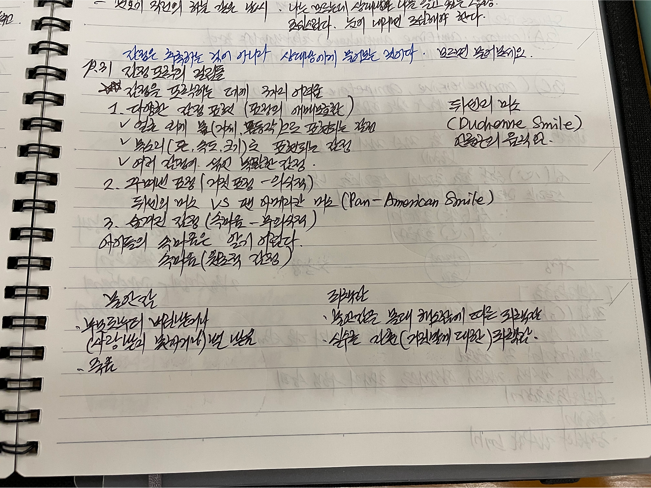 바로 늘 교육 시간 동안 필기한 노트를 가지고 다니며 매일 보는 연습을 하기로 했다. 심지어 홋카이도 여행을 갈 때도 챙겨 가서 틈나는 대로 필기 내용을 보며, 내 것으로 만들기 위해 노력을 했다. 이론과 실습이라는 영역의 사이에서 이론만 아는 것과 이론을 모른 채 실습만 하는 것은 아무 의미가 없고 교육의 효용성도 떨어진다. 즉, 알고 행함으로 익히는 것이 중요하다. 매일 일상 속 나와 마주하는 감정의 문제를 이론적으로 해석하고 실습을 통해 익힘으로 내 것으로 만드는 과정을 2주 동안 내가 해야 할 것임을 직감점으로 느낄 수 있었다.