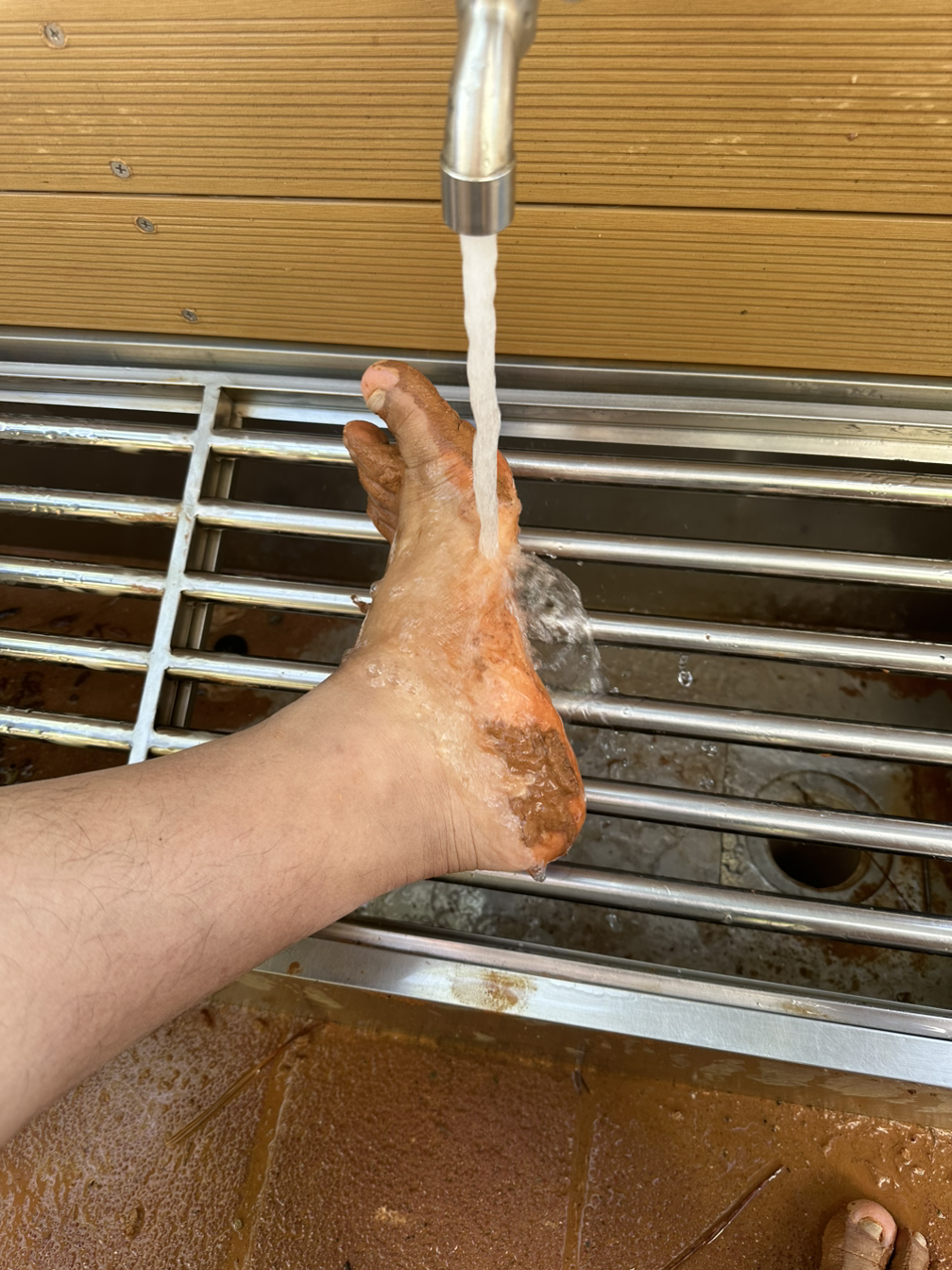 맨발 걷기를 마치고 발에 묻은 흙을 씻는데 황토로 물든 발을 보며 황토로 물든 삶을 꿈꾼다. 거친 흙을 다지고 다져 고귀한 백자를 만드는 도공의 손길처럼, 황토 맨발 걷기를 하며 내 삶도 황톳빛으로 물들어 갈 때 건강하고 자유로운 삶을 사는 신체가 만들어질 것이다. 건강한 육체에 건강한 정신이 깃든다는 말처럼 건강하게 글 쓰는 삶을 살기 위해 내 발을 황토로 물들일 것이다.