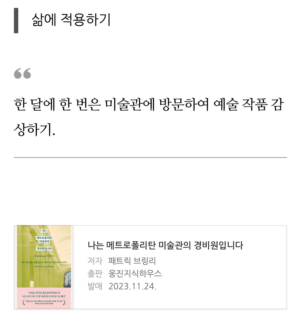 예술에 문외한인 내가 미술관을 방문한다는 것이 나조차도 이해할 수 없지만 <나는 메트로폴리탄 미술관의 경비원입니다>라는 책을 읽는 내내, 나도 미술관에 가보고 싶다는 생각이 들었다. 설령 내가 미술관에 전시된 작품을 보고 작가의 창작 의도나 전시 목적조차 모른다 할지라도 이름 모를 작가의 예술혼이 담긴 작품을 본다면, 내 안에서도 예술혼이 불씨가 타오르지 않을까 기대해 보았다.