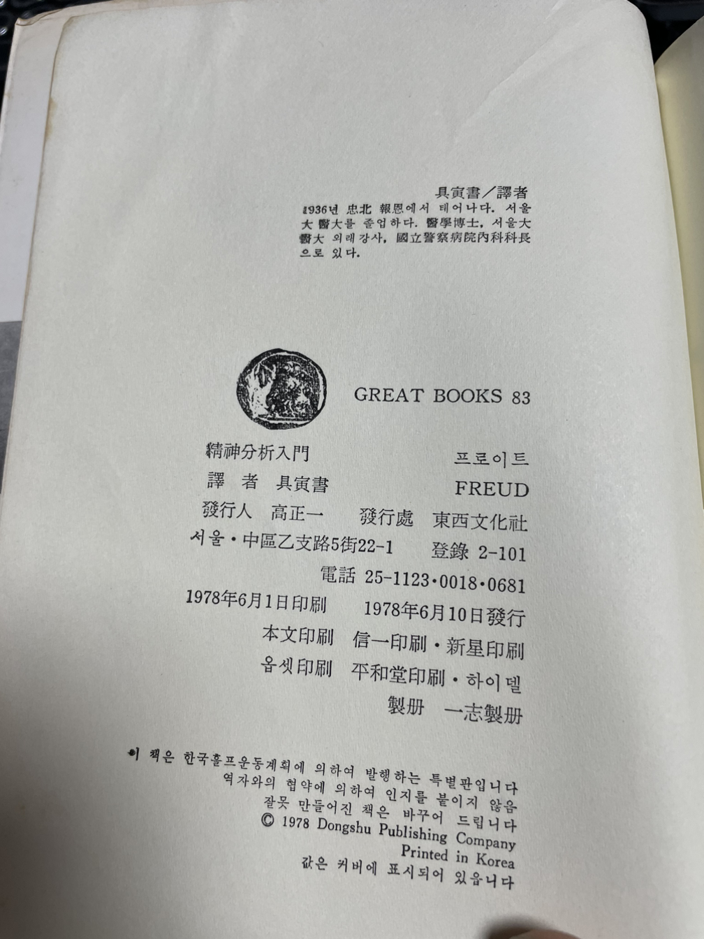 책을 좋아하셨던 장인어른의 유품으로 <프로이트의 정신분석학 입문>이란 책인데 1978년에 발행된 것으로 무려 46년의 나이를 가졌다. 마음의 깊은 상처를 입었을 때 나를 위로하고 심리학 공부의 세계로 이끌어 준 그 책이다. 물론 나는 다른 출판사에서 발행한 책을 읽었지만 그 속의 내용은 큰 차이가 없다. 다만 오른쪽부터 읽어야 해서 눈에 잘 들어오지 않을 뿐이다. 검색창에 찾아도 정보가 없는 한국홀프운동계획에 의해 동서문화사가 발행한 특별판인 이 책은 신기하게 뒷면지가 2번 있는 책이다.