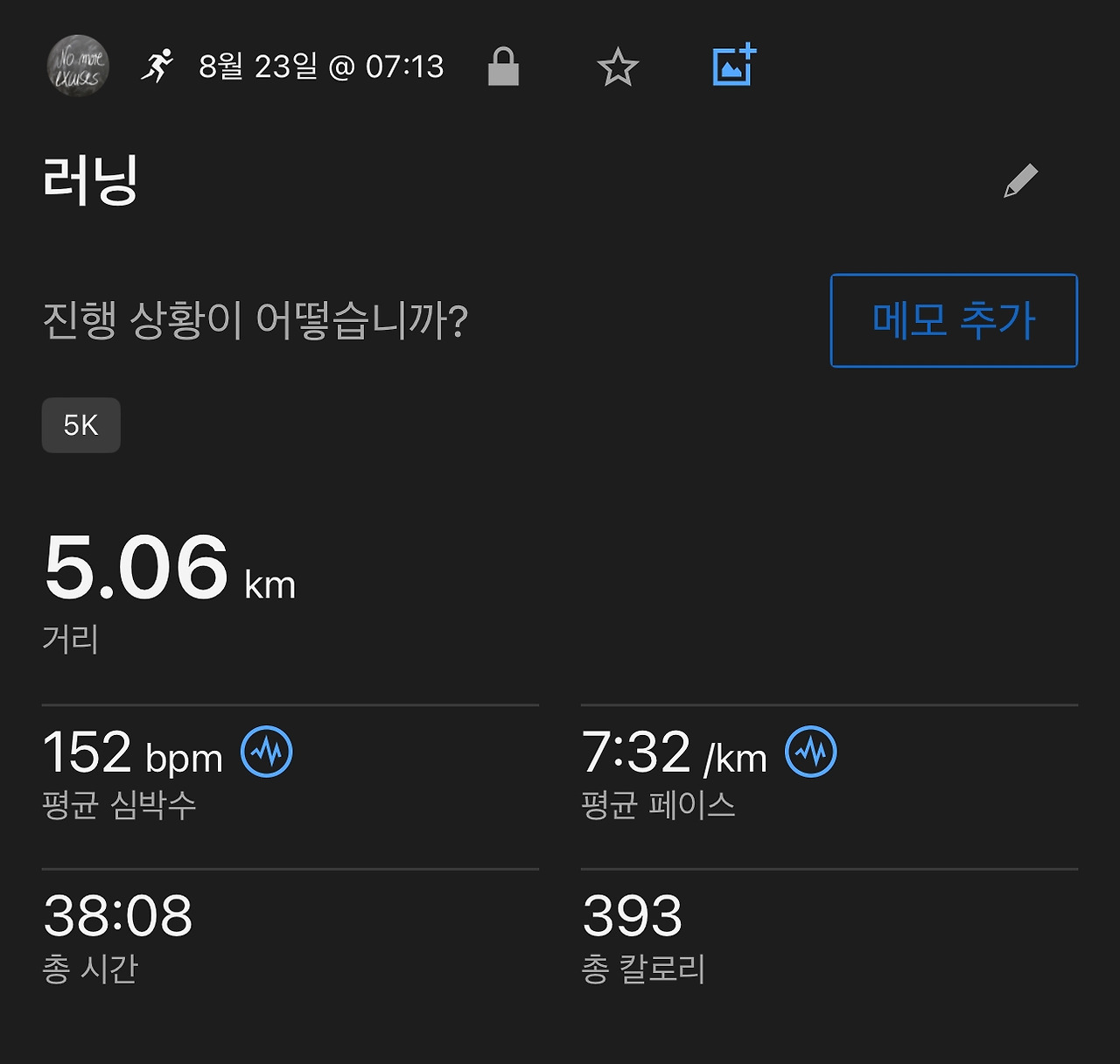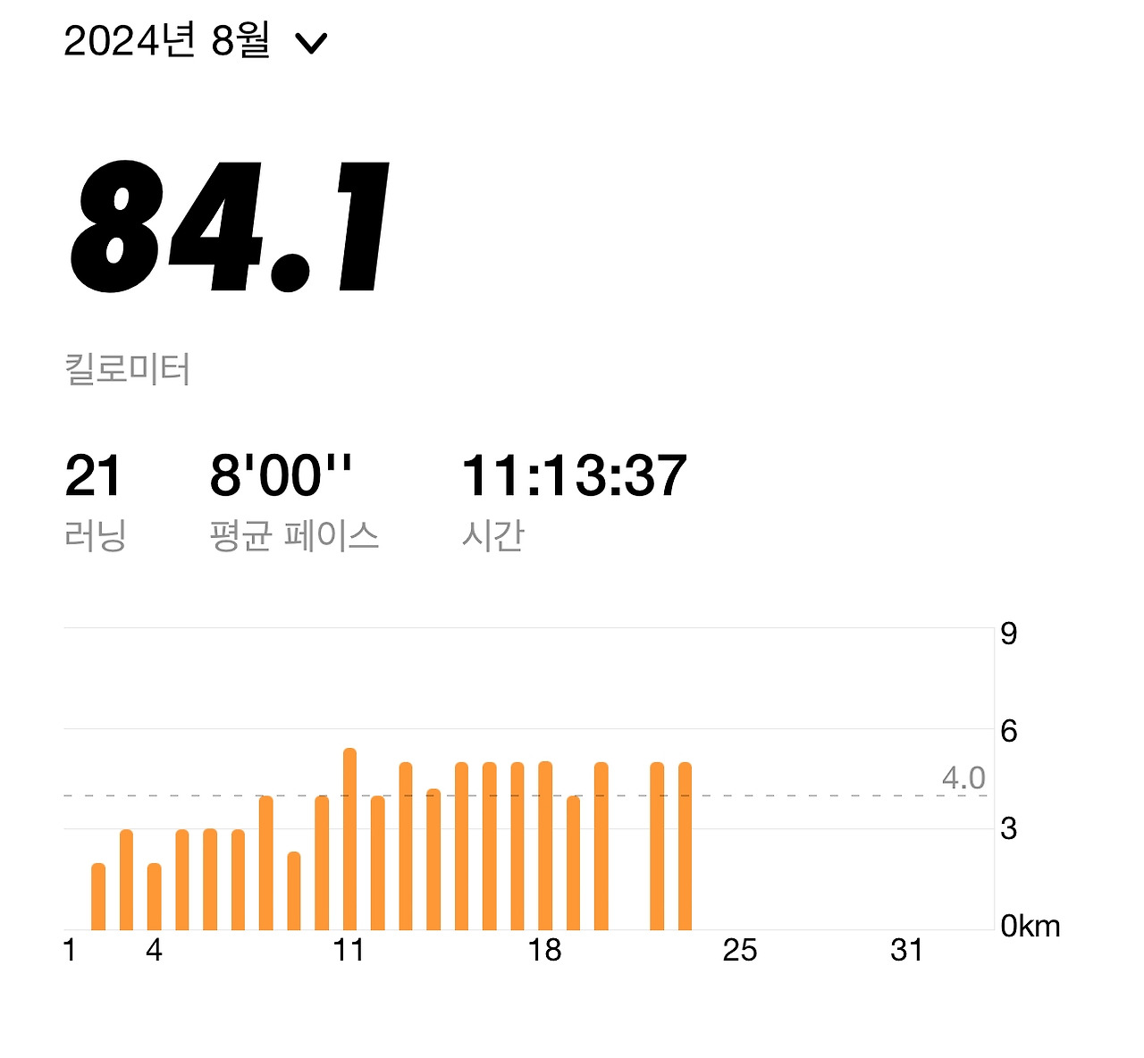 달린 후 결과를 분석하다가 8월 동안 달린 거리가 벌써 80km가 넘었다는 것을 확인하고는 올해의 목표를 누적 거리 150km로 잡았었는데 목표를 수정해야겠다는 생각이 들었다. 생각보다 매일 5km의 거리를 달리는 것이 누적 거리가 빠른 속도로 늘어남을 실감할 수 있었다.
