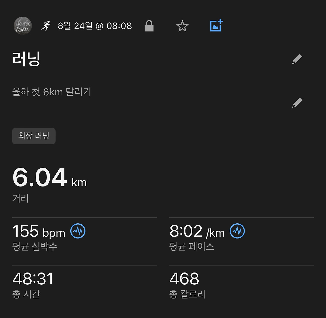 8월에는 5km의 거리를 지속적으로 연습하기로 계획했지만, 어느새 내 몸이 5km라는 거리에 적응한 것 같아서 토요일이라 시간적 여유도 있고 내 몸에 경각심을 주며 동시에 거리도 늘리는 것도 좋을 것 같아 조금 무리가 될 수도 있지만 그냥 시도했다.