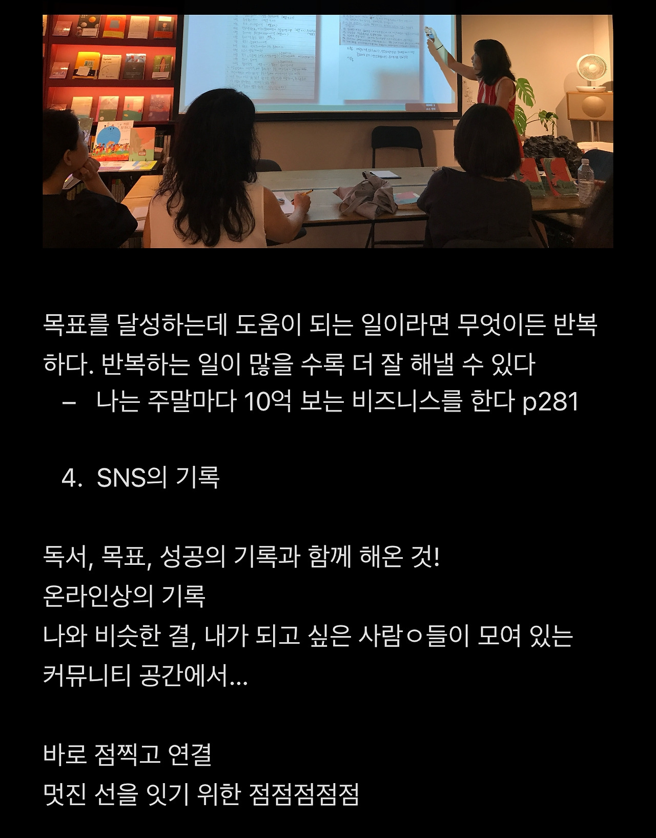 독서와 기록의 힘을 다시금 느끼며 오늘 내가 읽은 책이 내 삶이 되고, 오늘 내가 적은 기록이 일상의 흔적이 되어 오늘을 최고의 날로 만들기 위해 최선을 다했던 나의 노력이, 내일의 내가 어제보다 한 뼘 더 성장한 존재가 되기 위한 비결이라는 것을 느꼈다. 나도 나만의 독서의 기록을 남기며, 나의 성공 기록을 만들 것이다.