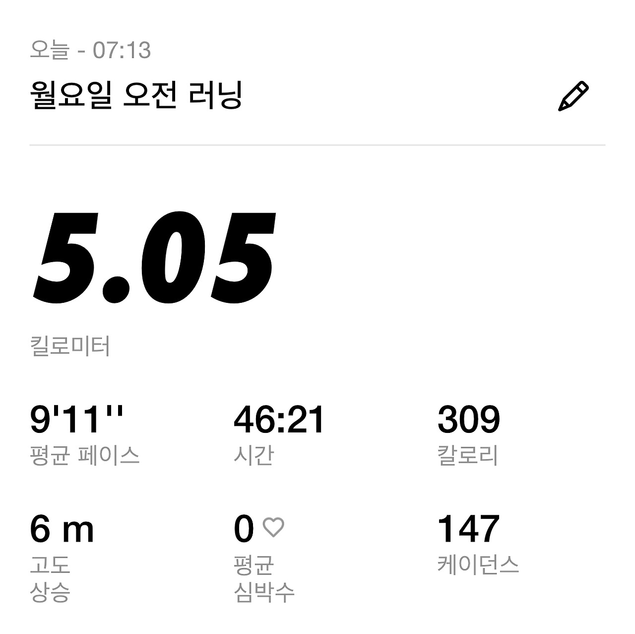 달리기를 하기 전에는 출근하느라 정신없는 월요일이지만 달리기를 시작한 이후 월요일에도 달리기를 해서 이전보다 기분 좋게 출근할 수 있다. 다만 욕심을 부려 출발할 시간에 임박해서 나갈 때도 몇 번 있었지만 다행히 지각한 적은 없다.