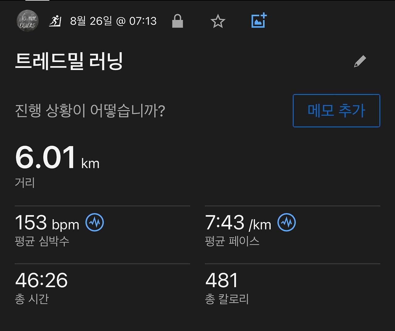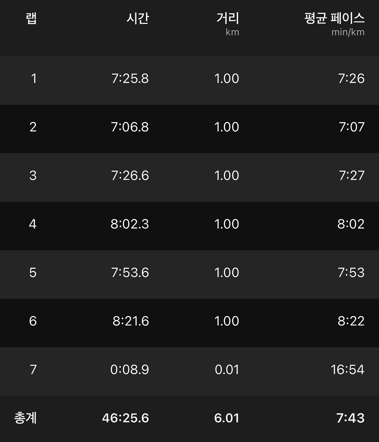 8월 동안은 체력 안배를 위해 계속 5km 달리기 연습을 하려고 했는데, 몸이 적응을 넘어 나태해지는 것 같은 느낌이 들어 무리라고 느끼기도 했지만 6km 달리기를 이틀째 도전했고, 운 좋게 성공할 수 있었다.
