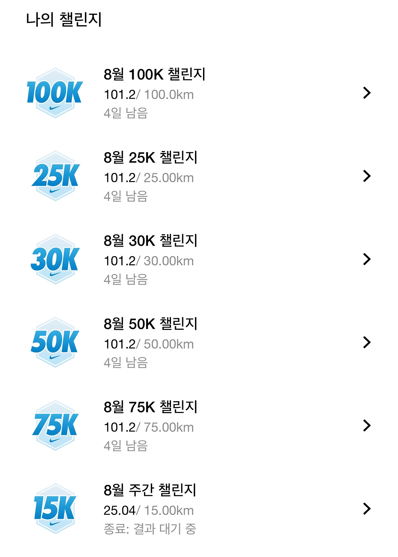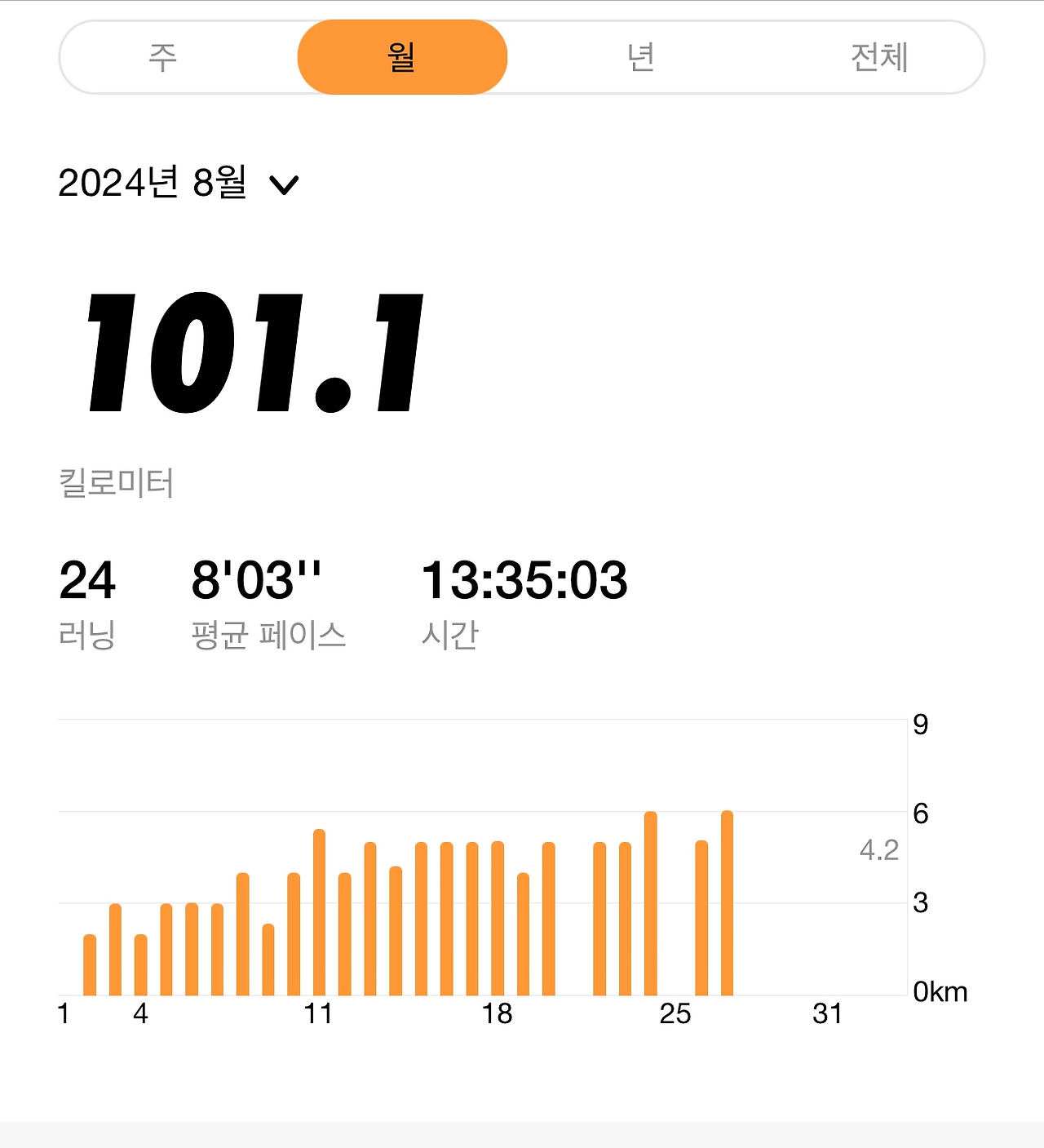 가끔 달리다 보면 달리기 전문가를 볼 수 있는데, 그분의 속도를 따라갈 수는 없지만 나만의 속도를 유지하며 달리다 보면 잠시 휴식을 취하며 걷는 그분들을 따라잡을 수 있다. 나의 속도로 다리면서 8월 한 달 동안, 100km 거리를 달렸다.