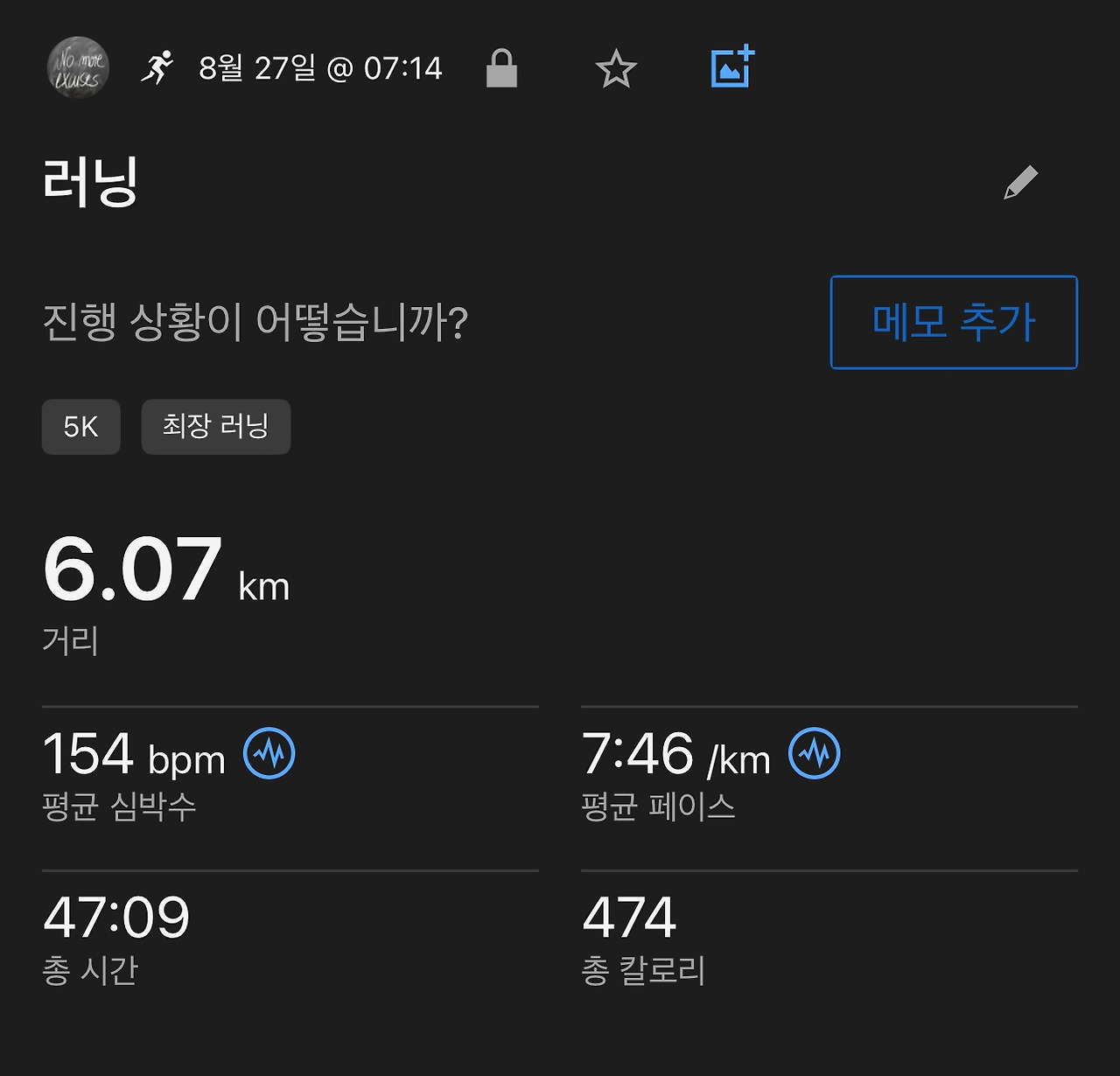 3km 구간까지는 무난히 달렸지만, 4km 구간이 넘으니 그만 달릴까 하는 생각이 들기도 했지만 꾹 참고 달렸다. 속도를 늦춰서라도 완주하고 싶었기에 속도를 조금 조절하면서 달리니, 호흡도 정리되고 편하게 달릴 수 있었다. 어제 170이 넘는 심박수에 조금 놀라긴 했지만, 한번 경험해 보았기에 별 신경 쓰지 않고 달렸다.