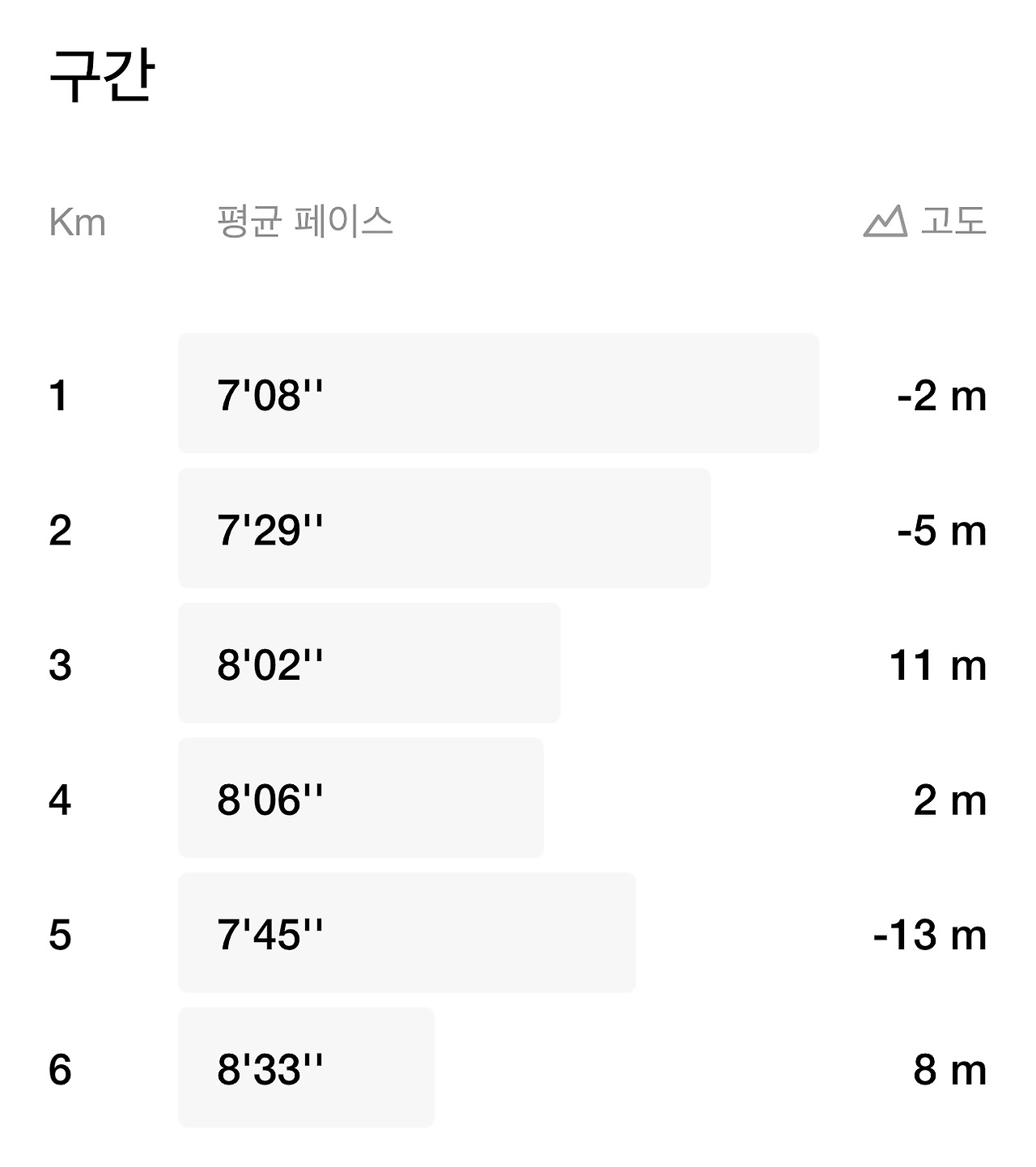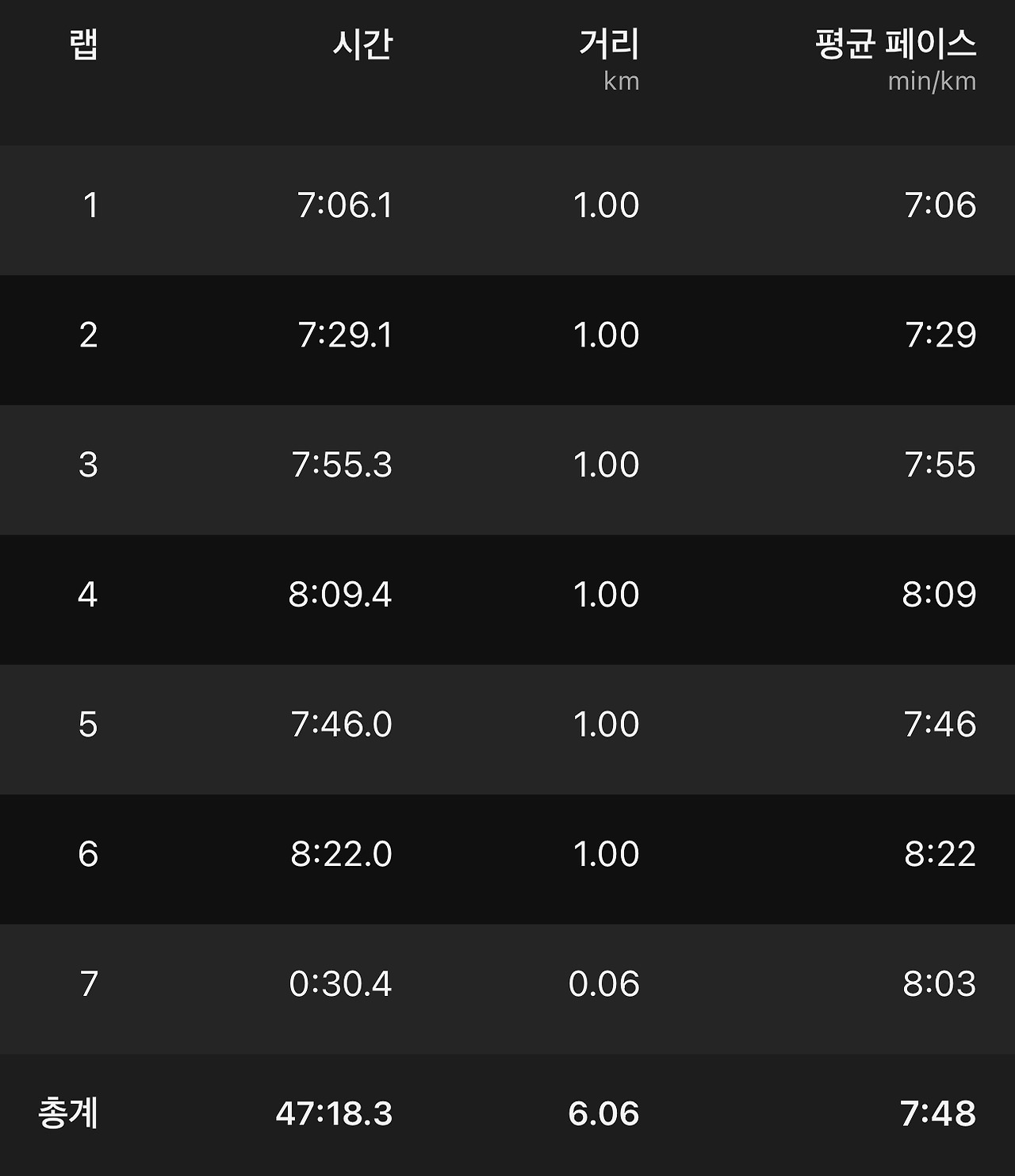 하늘을 보니 먹구름이 잔뜩 끼어 있어 기상청의 예보대로 비가 올 것만 같았다. 우중 달리기까지 염두에 두고 달렸는데 3km 구간을 넘어가기 시작하면서 빗방울이 조금씩 내렸다. 속도를 더 내면서 서둘러 달리기를 완주하려고 했기에 금세 체력이 떨어져 구간 별 속도가 늦어지는 것을 보았다. 아직 나는 속도를 내기에는 체력적인 문제가 있다고 생각하면서 속도를 줄이고 호흡과 자세를 유지하려고 노력했다.