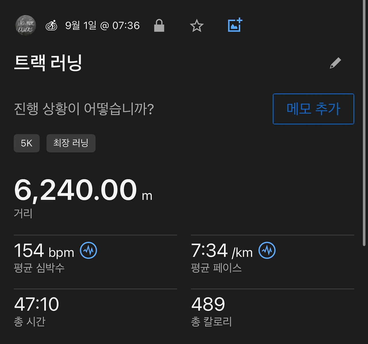 올해 목표 중 하나인 '나이키 런 클럽' 그린 러닝 레벨이 될 수 있도록 9월에서 부지런히 매일의 달리기를 할 것이다. 또한 9월 동안 누적 거리 150km를 달리기 위해서는 반드시 매일의 달리기를 해야 한다. 하루의 흔적이 쌓여 목표를 이루는 과정을 경험하면서 매일의 노력이 얼마나 중요한지를 다시 한번 느낄 것이다.