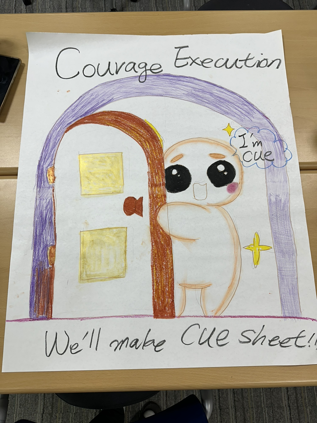 십 여분의 회의 끝에 찾아낸 두 가지의 핵심 키워드, ‘용기’와 ‘실행력’을 보여주는 그림을 그리기 위해 머리를 맞대었지만 모두 그림에 소질이 없었던지라 챗GPT와 Copilot에게 물어보았고 문을 열고 빼꼼히 바라보는 챗GPT의 제안을 만장일치로 받아들였다. 용기를 뜻하는 영단어 Courage와 실행력을 뜻하는 Execution을 조합하여 ‘CE’라고 이름을 지었지만, 부르기 쉽게 하기 위해 한 글자로 하자는 의견을 수렴해서 ’큐(Cue)’라는 이름을 지어주었다.