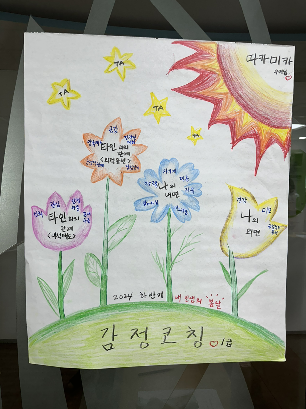 강의 중간중간 물을 충분히 마시며 몸속의 독소를 빼내려 했고, 과정 소개를 마칠 때쯤 몸도 점점 안정을 찾을 수 있어 강의에 집중할 수 있었다. 첫날이라 그런지 2급 과정의 리뷰를 하면서 감정코칭에 대한 다섯 가지 질문을 통해 그동안 배운 것을 회고하는 시간을 가졌다. 조별로 인터뷰한 내용을 나누고, 또다시 질문별로 핵심 내용을 추려내는 작업을 하면서 질문에 대한 본질을 찾으려고 했다. 질문별로 다시 조를 만들어 본질을 그림으로 표현하는 시간을 가졌는데 조원 모두가 집중하며 의견을 나누는 모습이 정말 인상 깊었다.