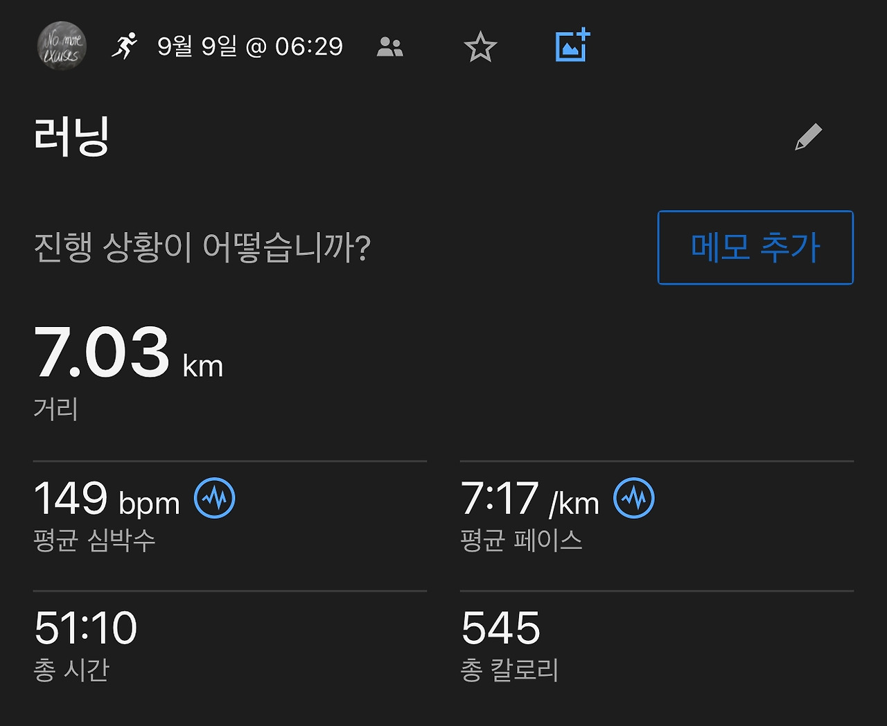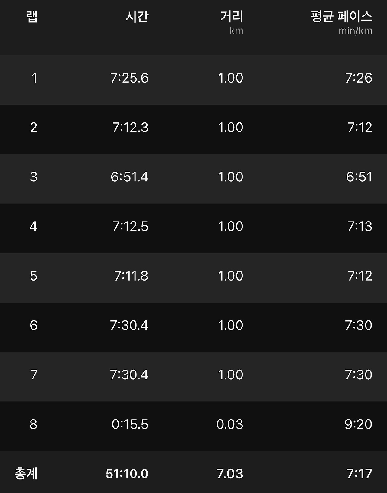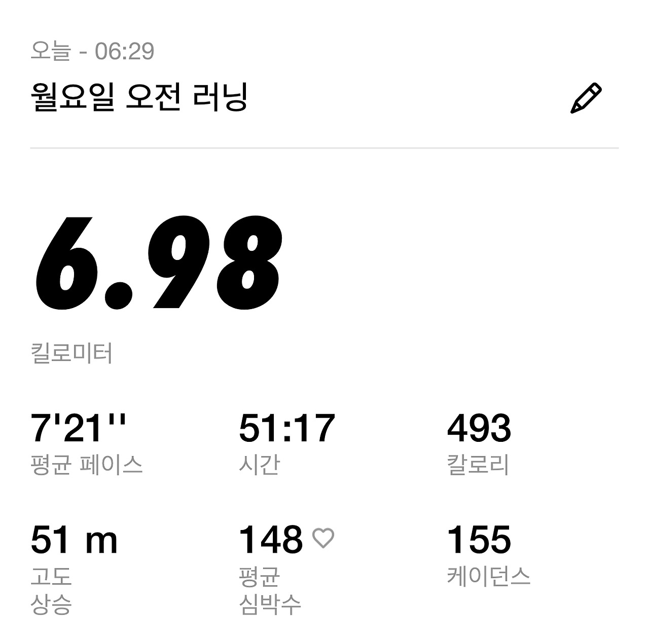 요즘 중점적으로 연습하고 있는 1시간 달리기를 오늘도 변함없이 하면서, 스트레칭에 신경을 조금 더 썼더니 회복 걷기까지 할 수 있는 시간이 부족함을 발견했다. 달리면서 조금 고민해 보았지만 1시간 달리기를 하면 지각할 수도 있다는 생각에 50분 달리기, 7km 거리를 달리면 달리기를 종료하고 바로 출근할 수 있도록 집 근처에서 마칠 수 있도록 경로를 급히 수정하였다.