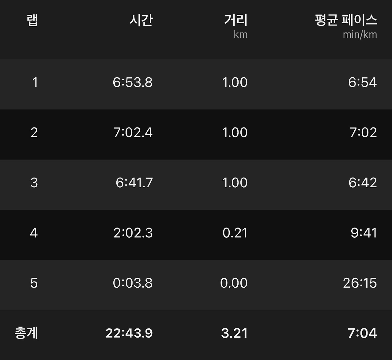 7분 4초의 페이스로 달리기를 마무리하면서 생각보다 빠른 22분의 시간이 소요되었고, 쿨다운을 위한 스트레칭을 하면서 달리기를 마무리했다. 만약 5km 마라톤 대회에 출전한다면 모든 힘들 다 쏟아부어 1위를 할 수 있는 무리수를 들지도 모른다는 상상을 했다. 동시에 장거리 달리기를 하려면 무엇보다도 체력이 필수라는 것을 다시금 느꼈다.