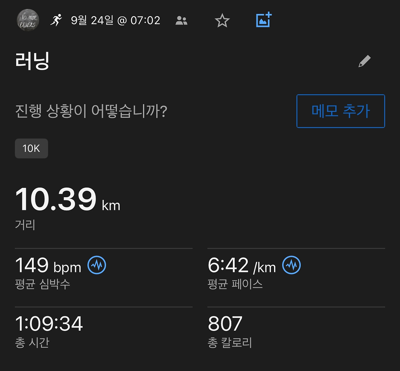 10km라는 거리를 언제 달려 보았는지 기억도 나지 않는 나였기에 과연 완주할 수 있을까 의구심이 들었지만, 이제 10km라는 거리가 그렇게 불가능하다고 느껴지지 않는다. 매일의 가상 마라톤 연습을 통해 10km의 거리가 자연스럽게 다가오기에 10월부터는 점점 거리를 늘려 12km, 15km 가상 마라톤 연습을 하며 마라톤 대회를 위한 체력을 만들 것이다.