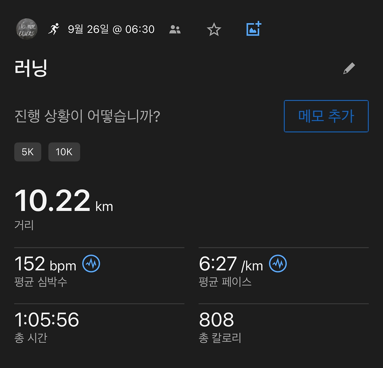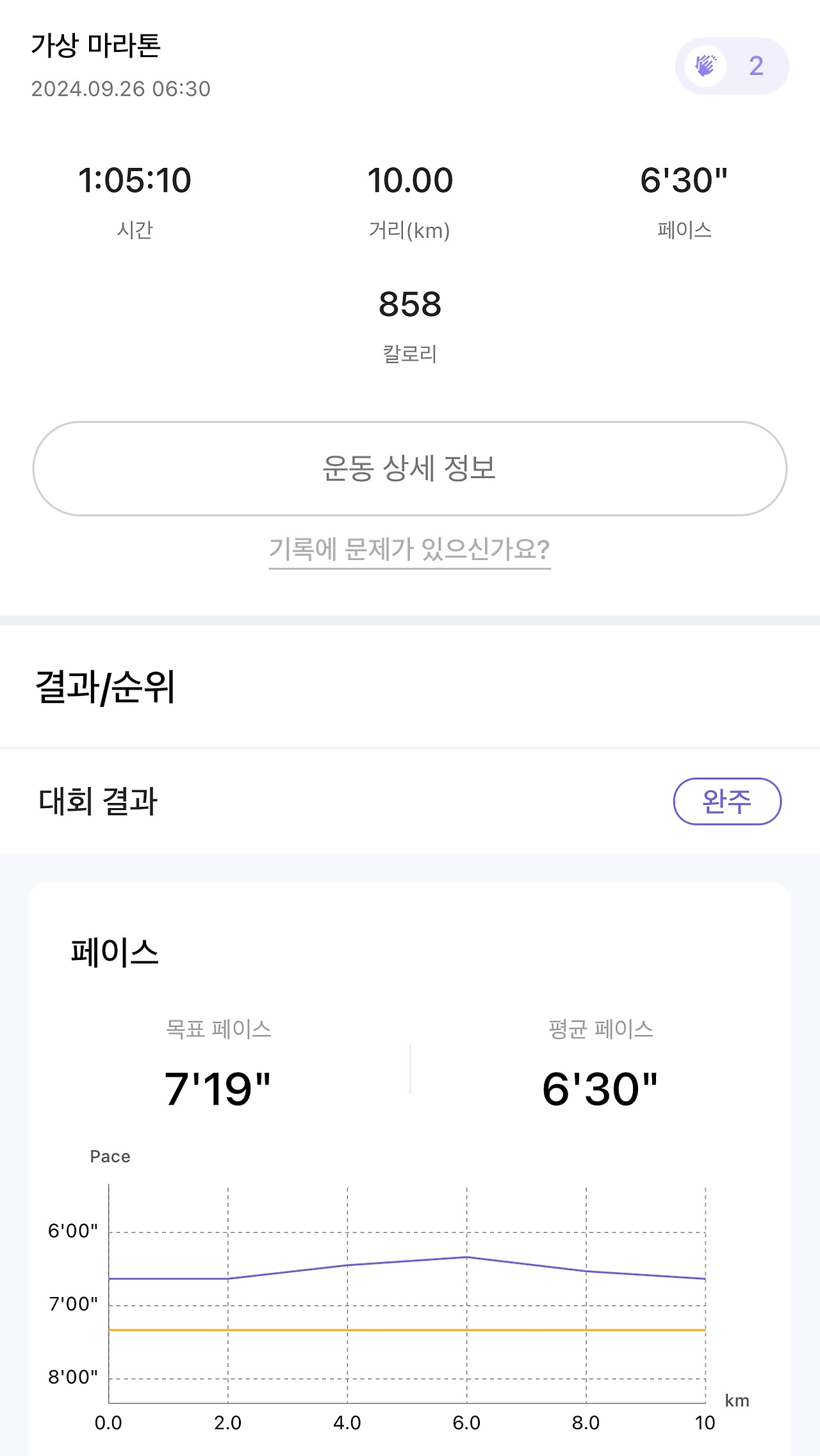 10km 가상 마라톤 연습의 반복 횟수가 많아지면서 익숙해지고 동시에 심박수도 안정되고 페이스도 빨라짐을 느낀다. 이때가 거리를 늘려 체력을 키워야 할 때이기에 임시 공휴일인 10월 1일에는 12km 가상 마라톤에 도전할 계획이다. 불과 두 달 전까지만 해도 고작 2km를 달렸을 뿐인데 입이 다물어지지 않고 심장이 터질 것만 같았던 내가 마라톤 하프 코스를 넘어 풀코스를 상상하는 날이 오게 될 줄 나조차도 예상하지 못했다. 달리기에 재능은 없지만, 매일 노력하는 이 순간들이 모여 재능을 뛰어넘는 날이 오도록 부단히 달리며 노력할 것이다.