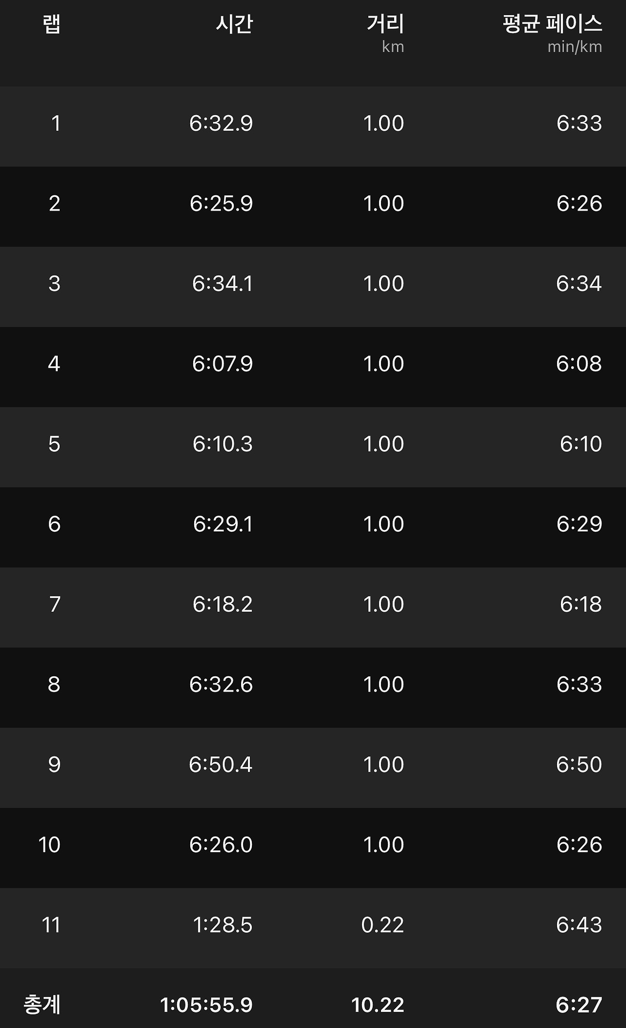 격일로 5km와 10km의 거리를 달리는 훈련이 익숙해져서 오늘은 과연 10km를 달릴 수 있을까 걱정하는 마음이 들지 않았다. 오히려 어떻게 하면 페이스를 유지할 수 있을까, 고질적으로 페이스가 저하되는 구간에서 페이스 유지를 할 수 있게 어떤 훈련을 해야 될지를 고민하며 달렸다. "힘들다, 숨이 차다, 멈추고 싶다"라는 유혹은 이제 더 이상 나에게 영향을 주지 못하기에, 오직 완주만을 상상하며 지금 달리는 이 순간에 집중하는 노력을 한다.