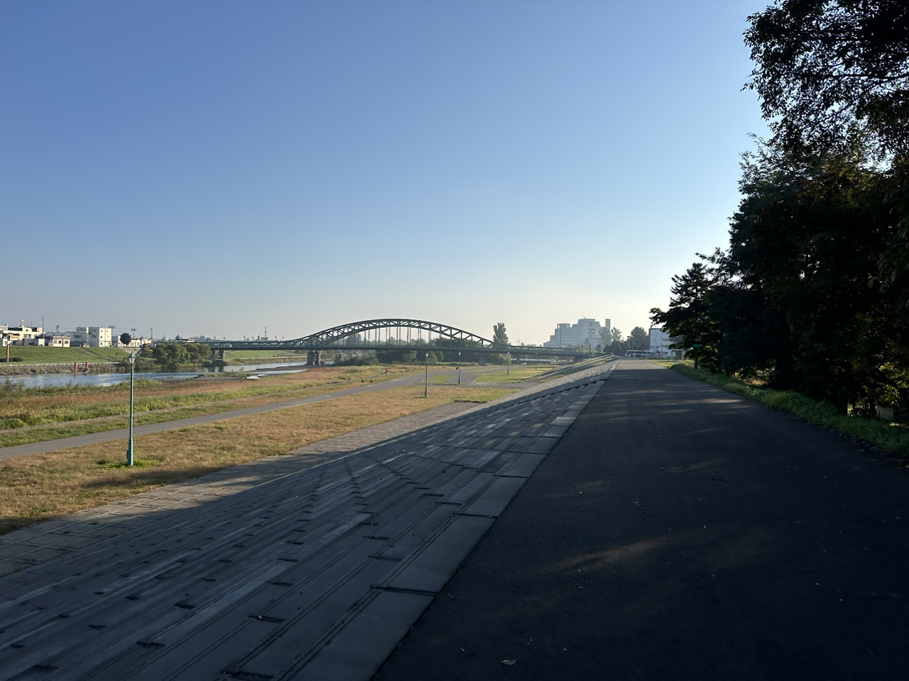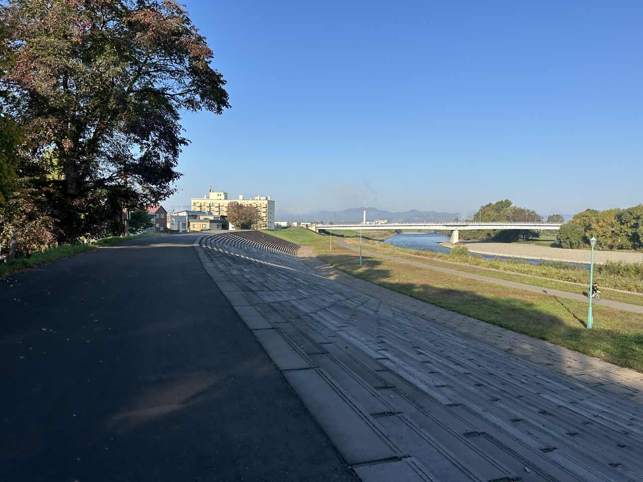 마침 새벽이라 지나다니는 차가 거의 없어도 횡단보도 신호를 잘 지키는 일본인들을 따라 신호를 준수하여 공원에 도달했고 고요함 속의 웅장함을 느끼며 도키와 코엔을 달렸다. 언뜻 보아도 수령이 오래된 것으로 보이는 나무를 보며 홋카이도의 침묵에 빠져들었다. 공원을 두 바퀴째 돌던 때 공원 옆 이시카리 강이 흐르는 제방으로 가는 길이 보여서 방향을 바꾸어 제방으로 올라갔다.