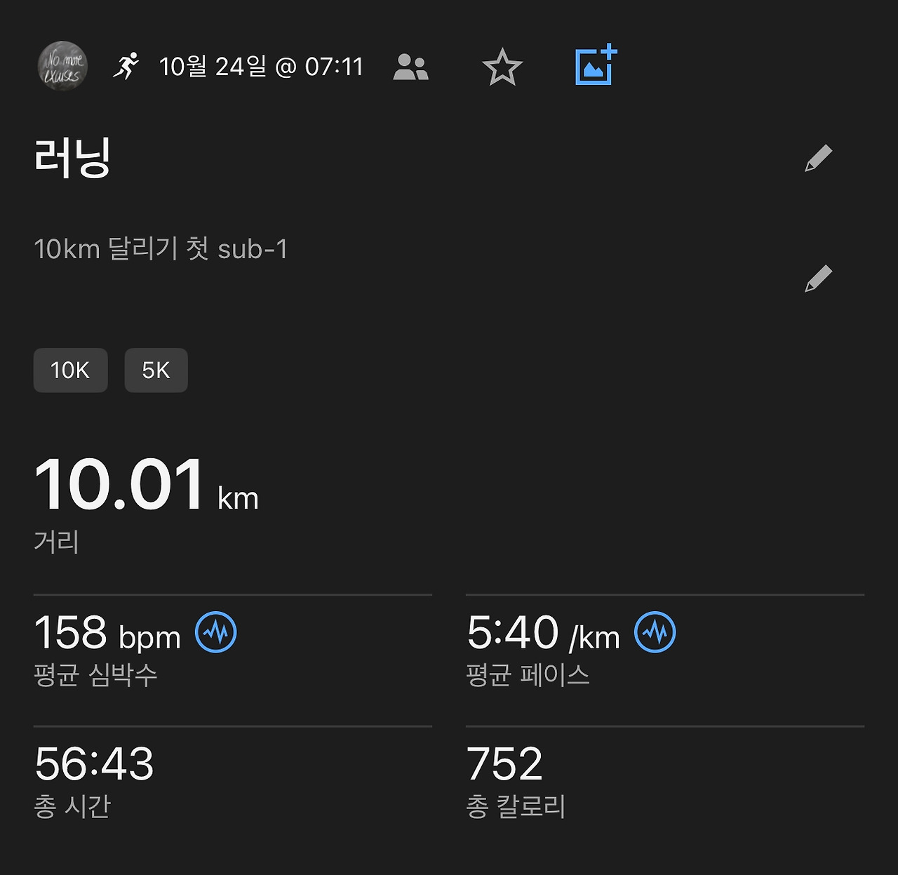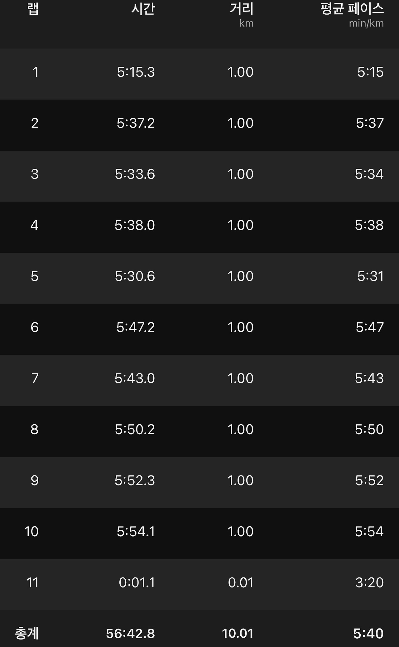 가장 고무적인 것은 7~8km 구간대에서 고질적으로 나타나는 급격한 페이스 저하 현상도 줄어들었다는 점이다. 물론 초반보다는 페이스가 느려지기는 했지만 거리가 늘어날수록 페이스의 저하 폭이 감소했다는 것에 의미를 두고 싶다. 그리고 가장 기뻤던 것은 달리기 인생 최초로 10km 달리기를 한 시간 안에 주파했다는 점이다. 하늘을 날 듯이 기뻤지만 출근 시간의 압박으로 간단하게 쿨다운을 하고 서둘러 집으로 돌아갔다.