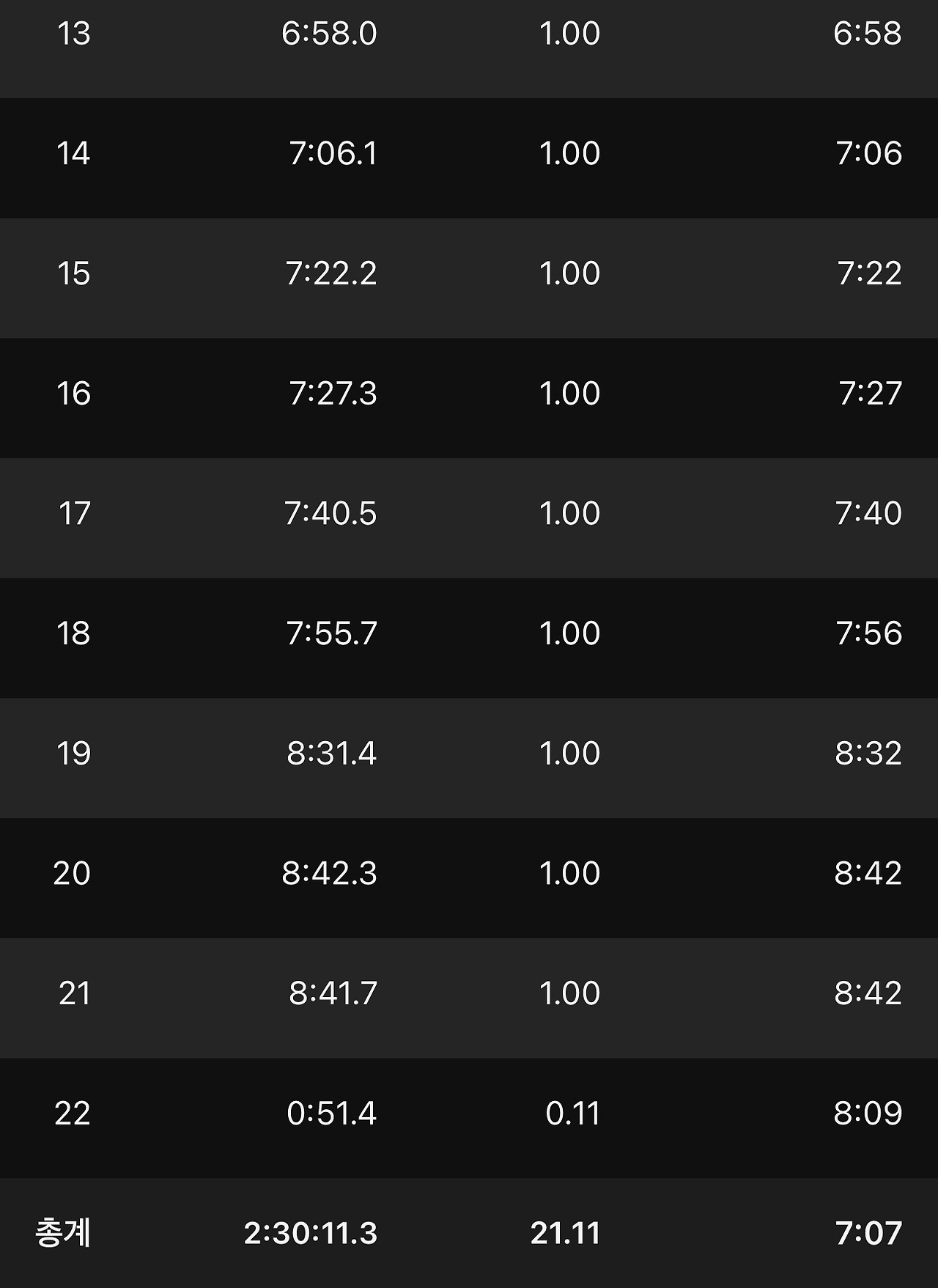 15km가 지나면서 급격하게 페이스가 떨어졌지만 절대 포기하고 싶지 않았기에 꾹 참고 달렸고, 18km가 되자 하나 남은 에너지 겔을 먹으며 체력을 회복하는 순간 "이제부터 정신력 싸움이다"라는 말이 나도 모르게 입 밖으로 나왔다. 정말 말 그대로 정신력으로 끝까지 완주해야 하는 상황이기에 더욱 정신을 차리고 달리려고 노력했다. 이미 페이스는 떨어질 대로 떨어져서 10분대를 바라보고 있었지만 아무런 문제가 되지 않았고 오직 완주만을 위해 달렸다.