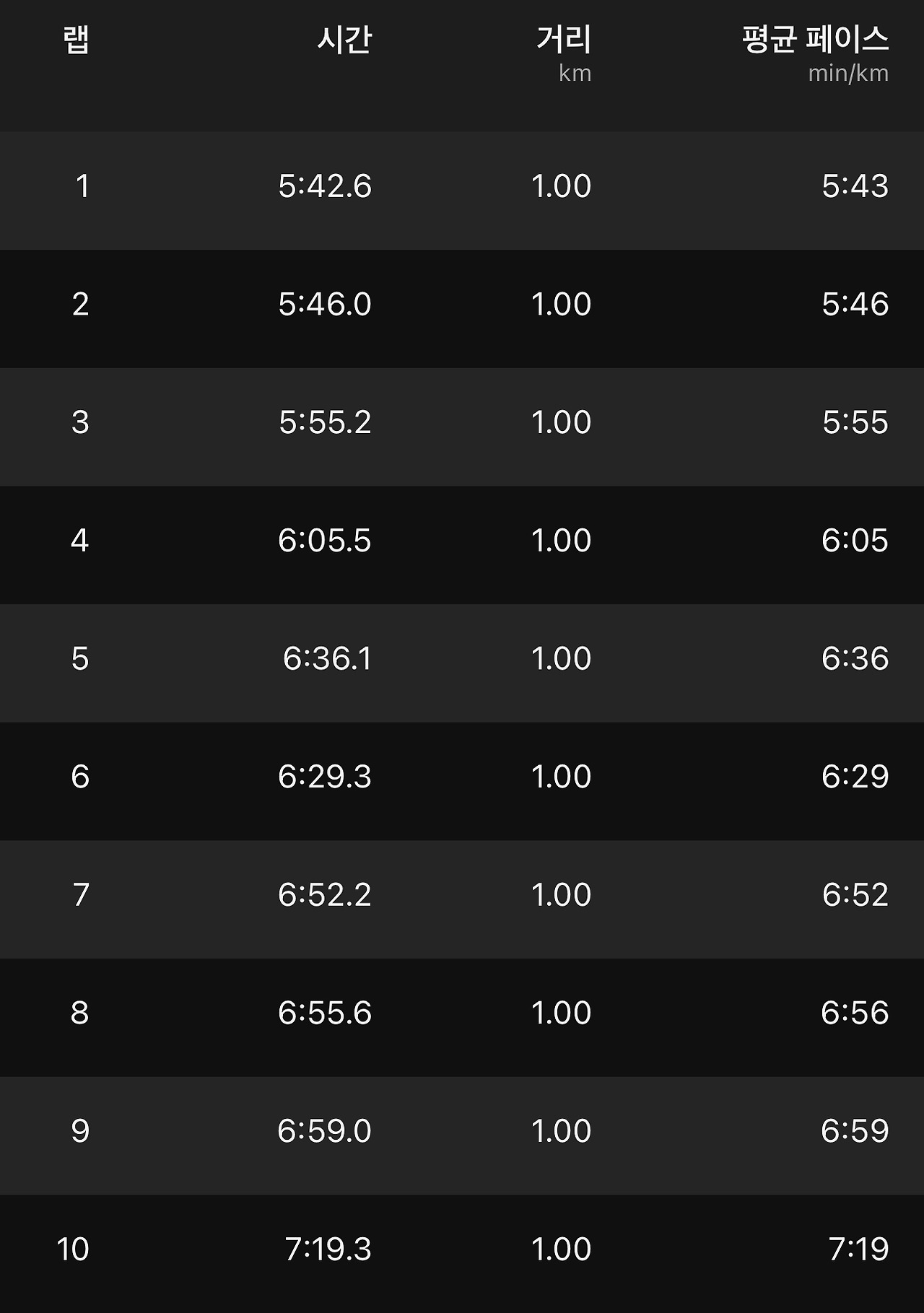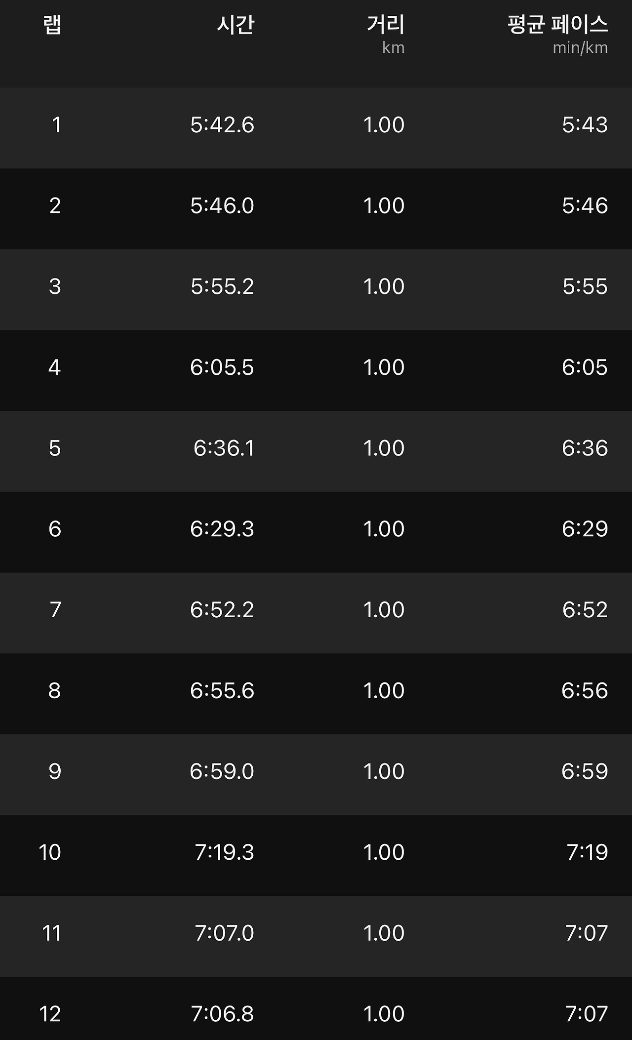 정말 오랜만에 라면을 먹으니 포만감과 함께 내 몸이 그토록 찾고 애원했던 탄수화물이 공급되는 것을 느낄 수 있었고, 가민 애플리케이션을 통해 운동 상세 정보를 보니 구간별 기록은 그렇게 나쁘지 않았다. 5km 구간도 30분대에 통과했고 10km 구간도 한 시간 오분으로 나쁜 편이 아니었지만 17km 구간 대부터는 점점 페이스가 느려짐을 알 수 있었다.