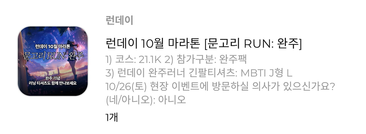 두 번의 15km 가상 마라톤(한 번은 12km 가상 마라톤에서 추가로 달린 경우)을 완주하고 문득 드는 생각이 여기서 고작 6km만 더 달리면 하프 마라톤 완주할 수 있겠다는 것이었다. 지금 되돌아보면 초보 러너가 참 어리석고 당돌한 생각을 한 것이지만, 그때는 조금만 더 연습하면 충분히 가능할 것이란 믿음으로 선 듯 런데이 애플리케이션에서 매월 진행하는 <문고리 마라톤> 하프 코스를 겁도 없이 신청했다.