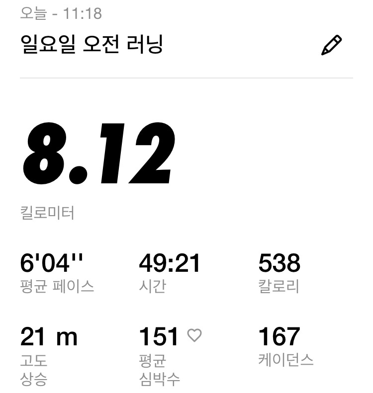 충분히 몸이 예열된 것을 확인하고 달리기 시작했고, 페이스보다는 심박수를 집중적으로 확인하면서 케이던스를 올리기 위해 의식적으로 보폭을 짧게 하면서 달렸다. 평일에 달렸던 코스가 아니라 주로 15km와 하프 마라톤을 연습하던 코스를 달렸는데 오랜만에 마주하는 코스를 보니 반가웠고, 곧 15km 달리기를 할 때 다시 만날 생각을 하니 어서 빨리 기본기 강화 시즌 3가 왔으면 좋겠다고 생각했다.