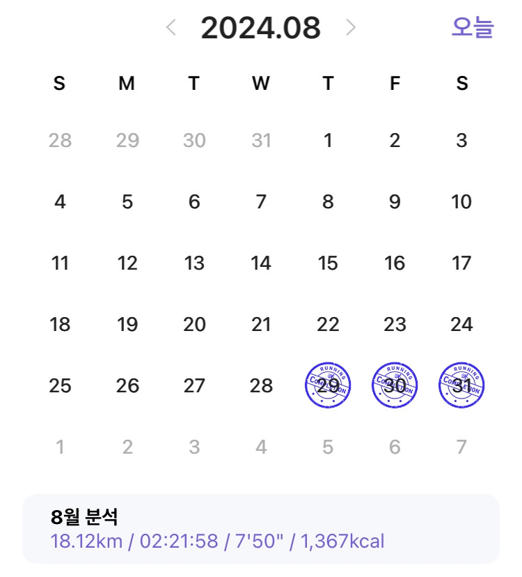 정말 달릴 수 없을 때는 걷기라도 하려고 하는 이유가 이 도장 찍는 재미에 빠져서 그런 것이지만, 결코 하루라도 헛되이 보내지 않으려는 나의 간절한 소망이자 삶에 대한 투쟁이며 동시에 나의 나태함을 향한 경고이기도 하다. 절대 다시 과거의 모습으로 돌아가지 않기 위해 매일의 달리기를 온전히 누리며 부단히 달리고 달릴 것이다.