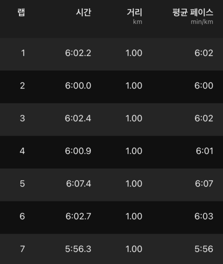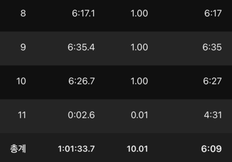 천천히 페이스를 조절하며 달려야지 생각했지만 달리다 보면 마음속에서는 10km의 거리를 1시간 안에 완주해야겠다는 욕망이 스멀스멀 올라온다. 이미 마음속에 마라톤 공식으로 자리 잡은 ‘1시간 안에 10km 완주하기’라는 생각은 이날도 변함없이 내 생각을 사로잡았다.