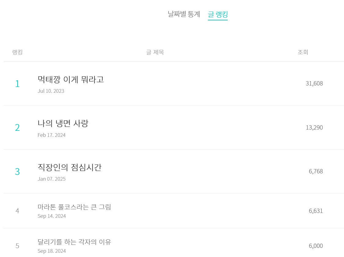 주로 스마트폰이나 태블릿 PC를 이용해서 글쓰기를 하기에 내가 쓴 글의 랭킹을 확인하는 일은 거의 없지만 <직장인의 점심시간>이란 글의 조회수 알람을 보고 지금까지 내가 쓴 글 중 가장 조회수가 많이 나온 글이 무엇인지 궁금해 찾아보았다. 역시 '음식'에 대한 글이었고 정확하게 말하면 2023년 상반기 핫아이템이었던 스낵, 먹태깡에 대한 이야기였다.