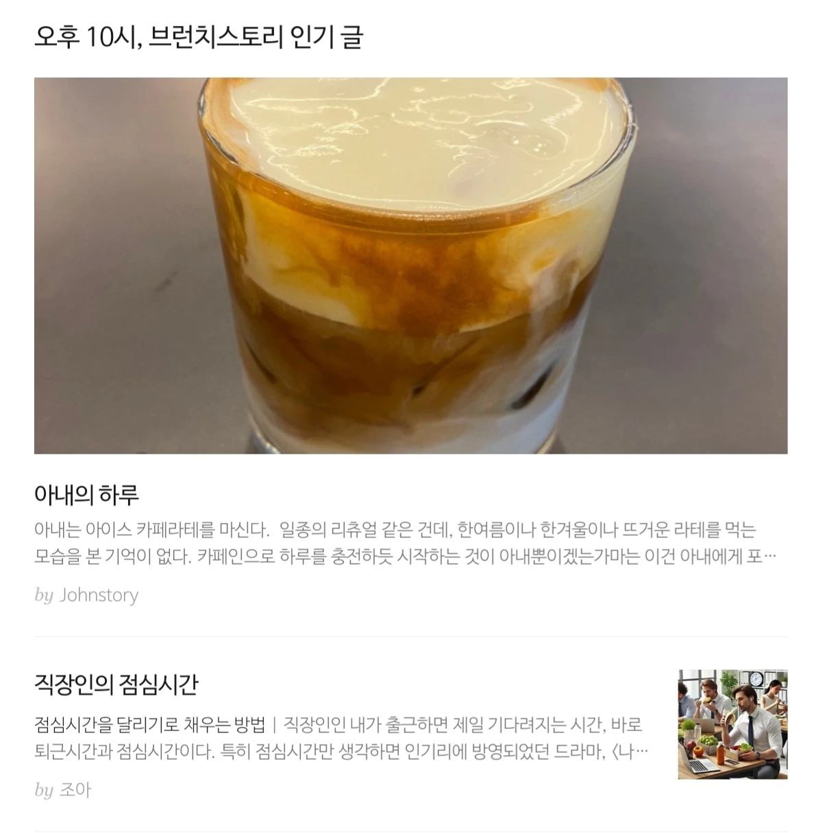 어젯밤 일찍 자느라 못 봤지만 지인이 보내준 메시지에는 <직장인의 점심시간>이란 글이 브런치 스토리 인기 글이라는 사진이 첨부되어 있었다. 내가 뭐라고 내 글이 인기글이 되었는지 잘 모르겠지만 분명한 것은 부족한 내 글을 읽어주신 독자님들 덕분에 가능한 일이라는 사실이다. 아무리 잘 쓴 글이라 할지라도 그 글을 읽어주는 독자가 없다면 결코 잘 쓴 글이라는 평가는 물론 글 자체가 살아남기 어려울 것이다.