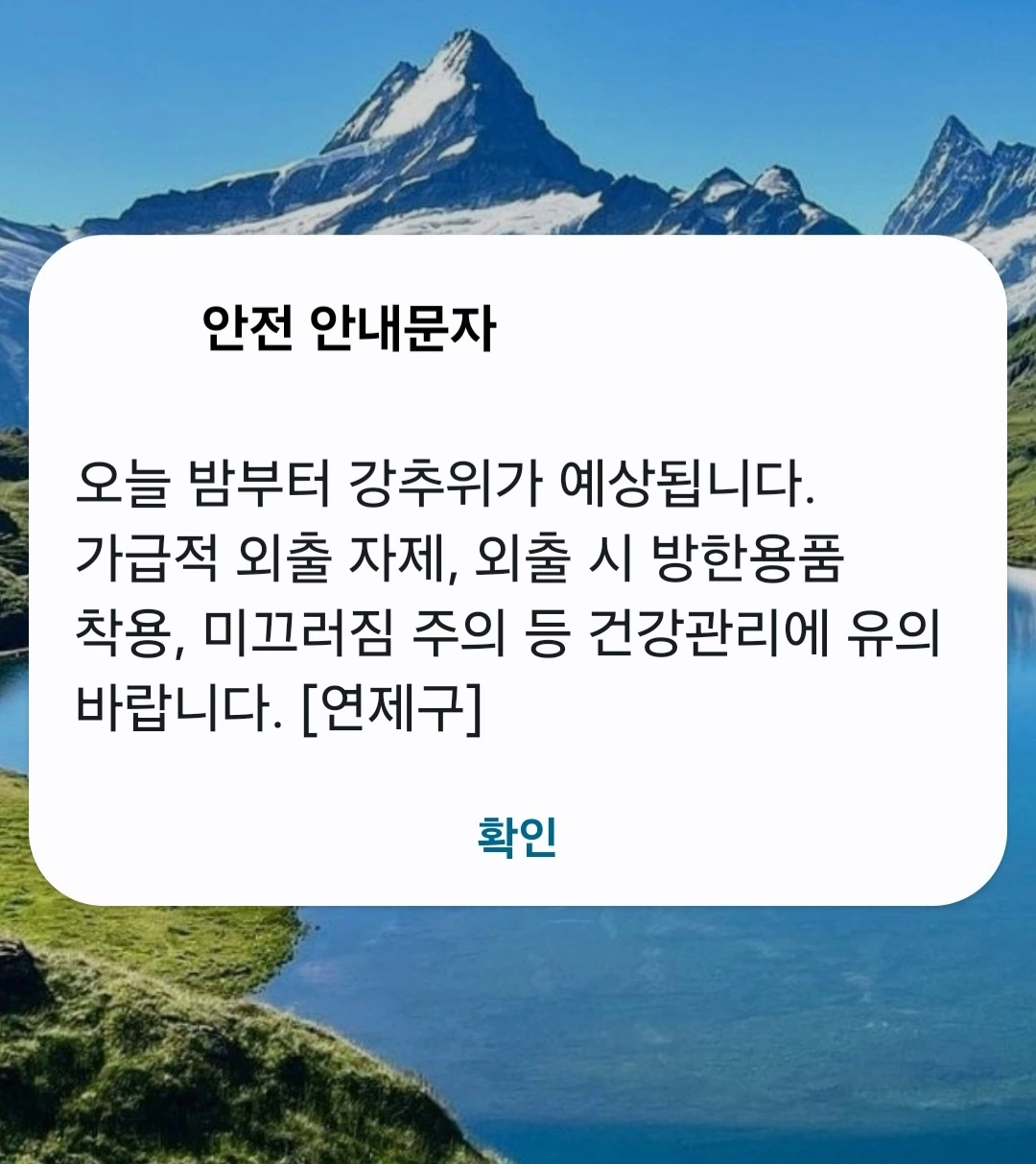달리기를 하고 업무 현장으로 가는 길, 스마트폰 알람을 보고 마음이 푸근해졌다. 내일의 강추위를 알리는 안전문자였는데 오늘 점심 달리기를 하지 않았으면 내일은 강추위에 벌벌 떨며 달리기를 해야 했을지도 모르고, 추위에 달리기를 할지 말지 고민해야 했을 수도 있다.