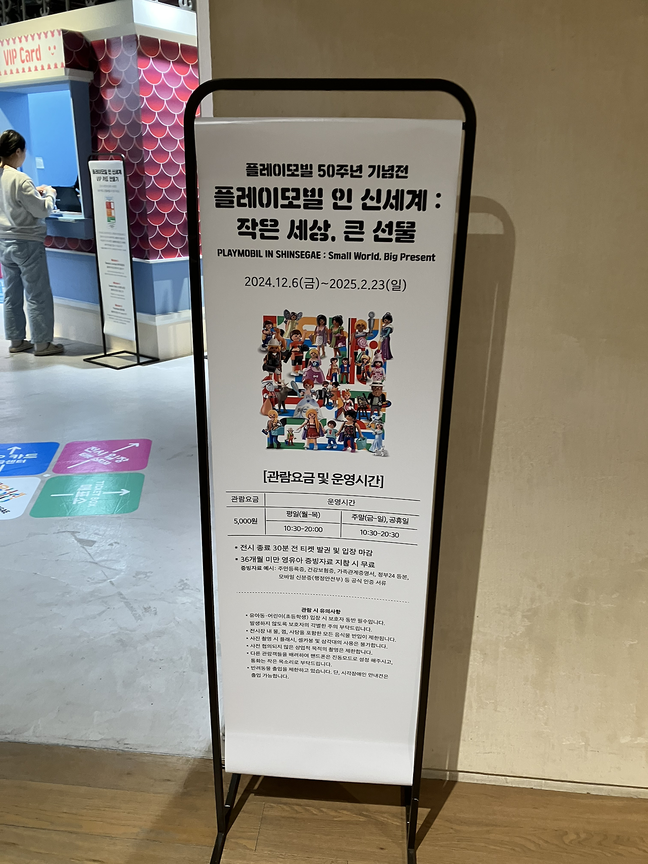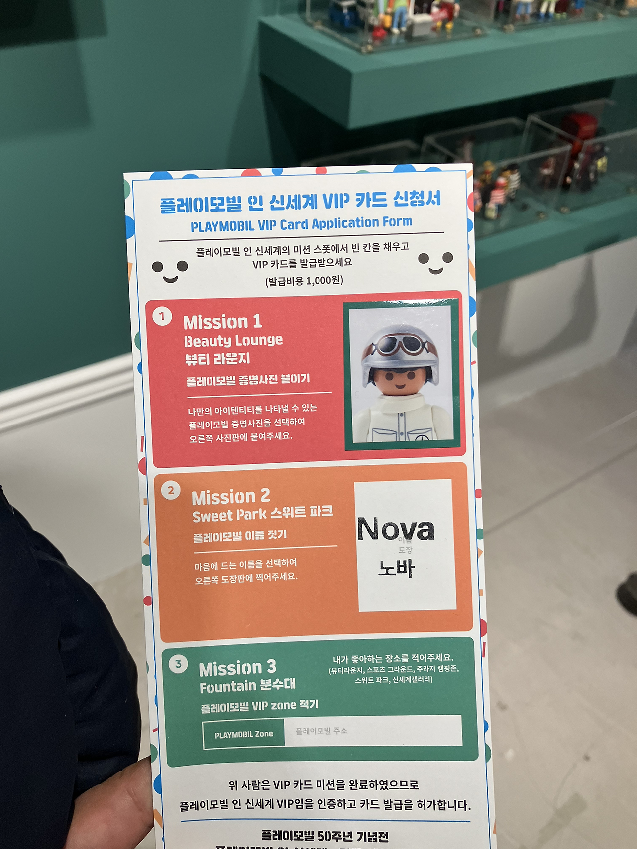 이렇게 좋아하는 장난감인 플레이 모빌 전시회를 한다니 반가움과 신기함에 서둘러 찾아갔고 입장권을 구매하여 전시장 안으로 들어갔다. 입장권을 구매하면서 'VIP 카드 신청서'까지 함께 결제해서 각 부스에서 주어지는 퀴즈를 풀면서 한 곳씩 구경했다. 특히 출시 50주년 기념이라 더욱 특별히 전시된 모델들을 신기한 눈으로 바라보며 좋아하는 플레이 모빌을 즐길 수 있는 이 시간이 좋았다.