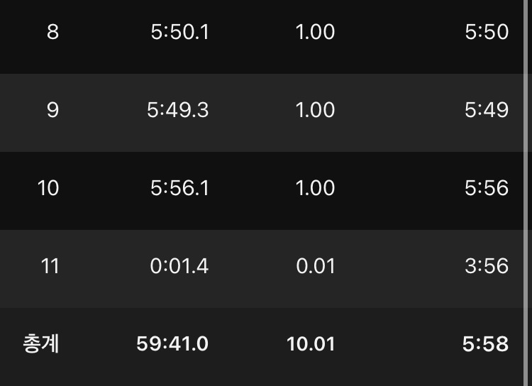 정말 오랜만에 10km 달리기를 했더니 조금 힘들기는 했지만 달릴 수 있다는 것과 비정기적이지만 10km 달리기를 놓지 않는다는 점에 감사할 수 있었다. 한 시간 안에 완주하면서 올해의 도전에 한 발짝 다가갈 수 있는 것은 덤으로 얻는 기쁨이었다. 이런 기븜을 지속적으로 누리도록 매주 일요일에는 10km 달리기를 할 생각이다. 앞으로 일요일은 10km 달리는 날이다.