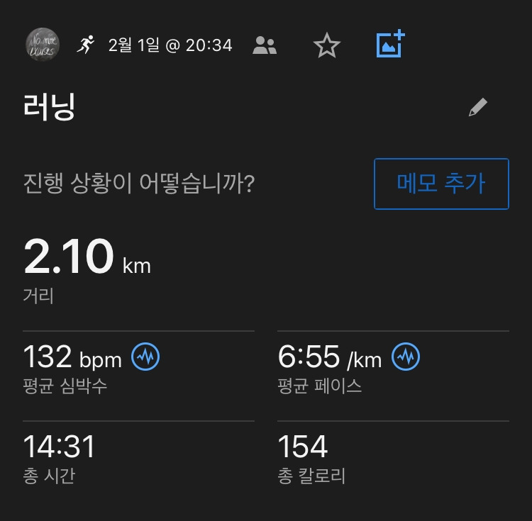 천천히 페이스를 조절하며 1km 달리기를 했고 연이어 2.1km 달리기를 하면서 2월의 첫날 달리기를 즐겼다. 매월 첫날과 같은 거리를 달리겠다는 시도를 통해 그 달의 달리기 목표를 정하면서 새로운 다짐을 하는 시간을 가진다. 지난달의 달리기를 반성하면서 이번 달에는 무엇을 개선하고 어떤 훈련을 해야 할지 고민하다 보니 2.1km 달리기를 금방 끝낼 수 있었다. 비 때문에 일찍 시작하지 못해 아쉬움이 남았지만 일요일의 약속을 위해 쿨다운을 하고 집으로 돌아갔다.