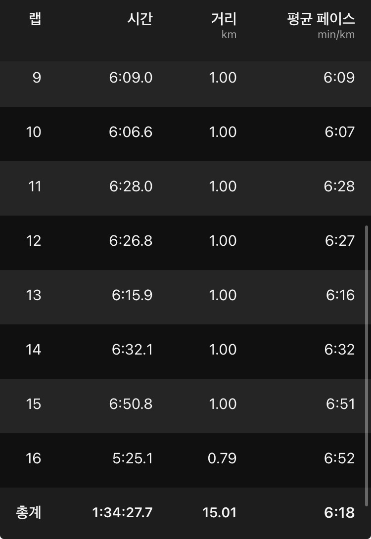 대신 이것저것과 병행하기는 어렵다. 오직 15km 달리기 훈련을 위해 하루를 집중하며 사용하는 것이 필요하다. 아내와 아이가 돌아올 시간에 맞춰 귀가할 수 있도록 생각했던 것보다 조금 늦게 나가 15km 달리기 훈련을 했고 천천히 달려 연휴 마지막 날보다 조금 늦게 완주하기는 했지만 1시간 30분 대를 유지할 수 있었다. 하프 마라톤을 2시간 이내 완주하기 위해서는 더 많은 훈련이 필요할 것이다.