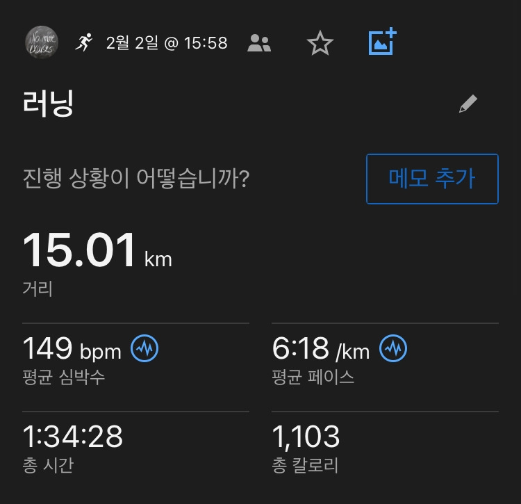 설 연휴 동안 달리기에 집중해서 그런지 몰라도 10km보다 더 달릴 수 있다는 느낌이 들어 오늘은 15km 달리기에 도전했다. 연휴 마지막 날, 아쉬움을 뒤로하고 달렸던 15km 훈련을 한 번 더 하면 좋겠다는 생각으로 달렸고 대신 익숙한 10km 달리기보다 페이스를 조절하며 천천히 달리기로 했다. 몇 번 15km 달리기를 한 적이 있지만 나에게 익숙하지 않은 거리라서 무리하지 않기로 했다.