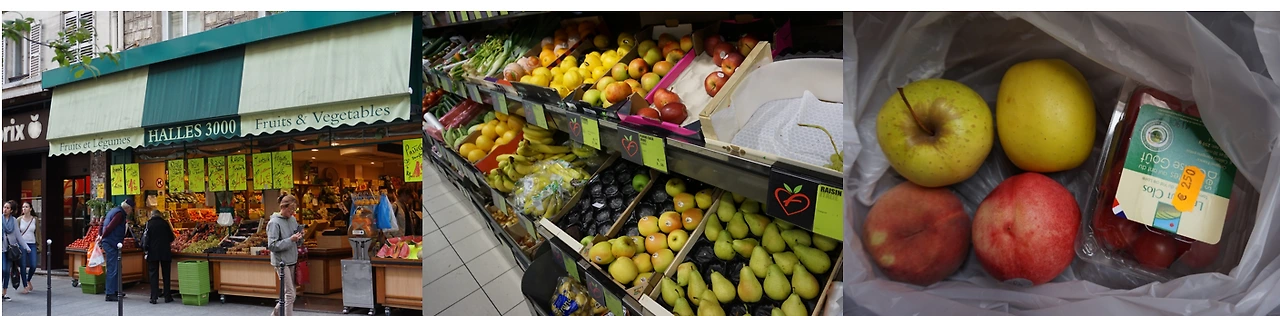초록색 사과-아오리라고도 부른다지?- 의 계절이 끝날 때쯤, 아주 짧은 그 기간 동안 초록색 사과를 더 많이 먹지 못한 것을 한탄할 때쯤, 파리의 과일가게에서 만난 초록색 사과들. 과일이 어찌나 많던지 그곳에 서서 한참 동안 구경해야만 했어. 그러고 나서 초록색 사과와 납작하게 생긴 신기하게 생긴 복숭아, 동그랗게 생긴 내가 보던 복숭아, 친숙한 방울토마토, 모과같이 생긴 과일도 골라봤지.
